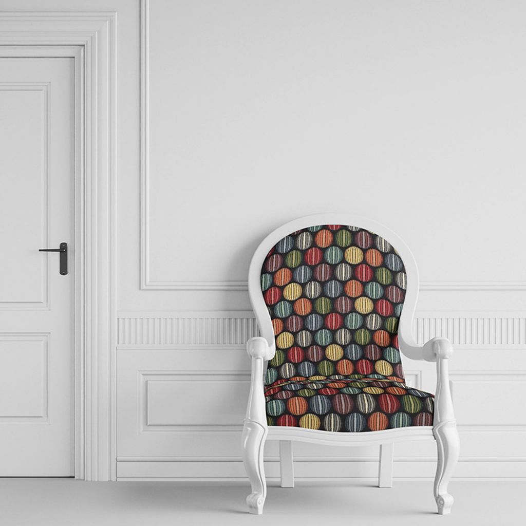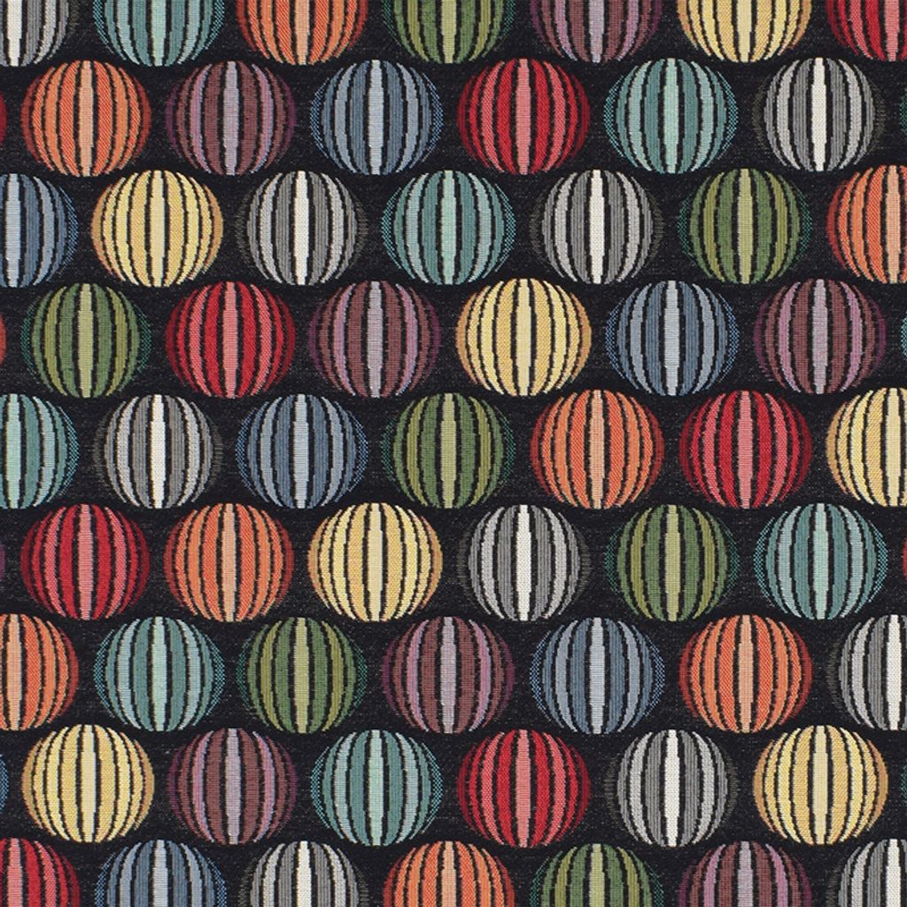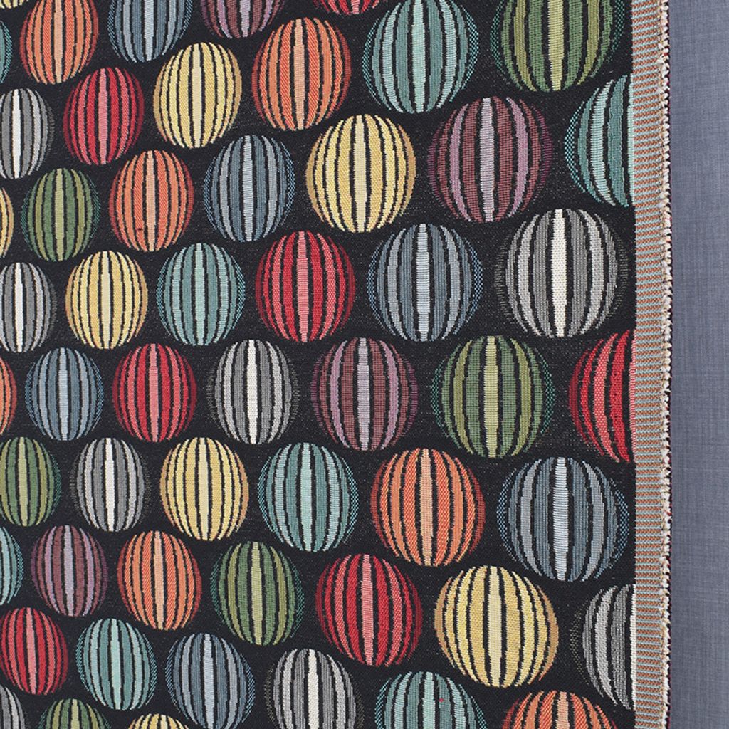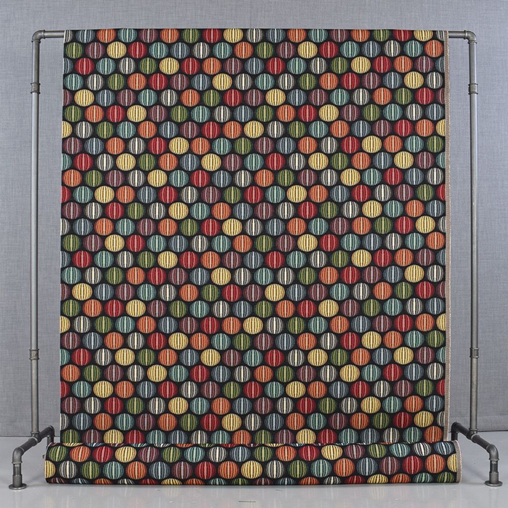 Multifärgat möbeltyg även kallat gobeläng tyg. Snyggt mönster med svart botten och multifärgade cirklar