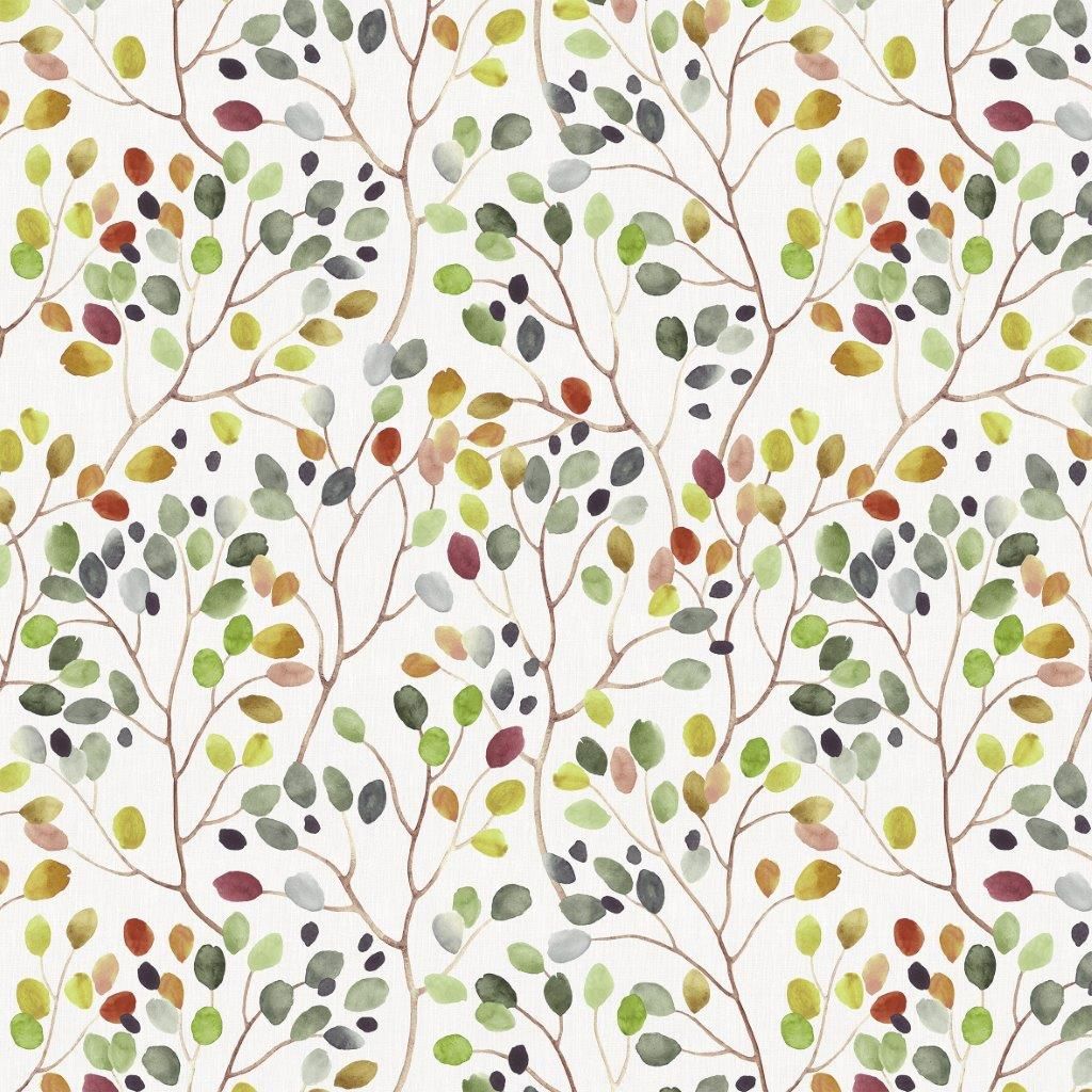 Vackert mönstret av grenar och blad i akvarelltoner av grönt, rost och dämpade jordfärger ger en harmonisk och tidlös känsla. Inspirerat av naturens skiftningar är detta tyg perfekt för gardiner, kuddfodral eller andra dekorativa textilier.