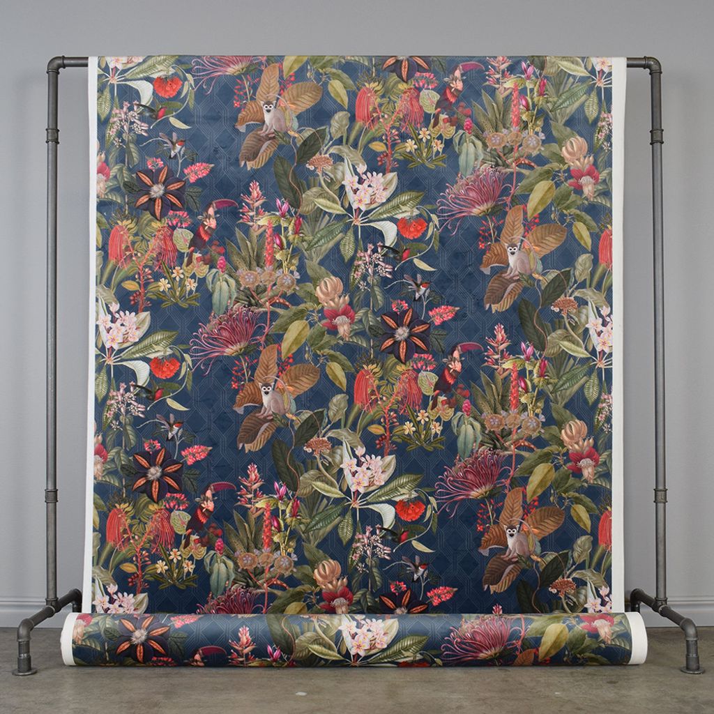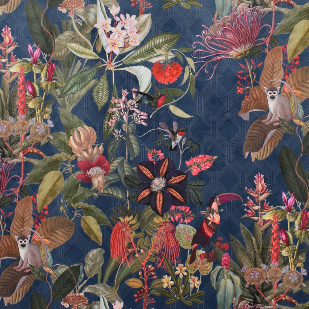 Tyg för gardiner och inredning. Ett fantastiskt tyg med sammetsyta och ett magiskt mönster med blommor, apor och fåglar. Bakgrunden på tyget har ett vackert grafiskt mönster. Underbar tyngd och passar perfekt till gardiner och kuddfodral.