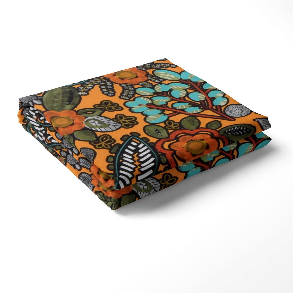 Sanza bordsduk är en färgstark och livfull duk med ett djärvt, blommigt mönster i varma orange, turkosa och gröna toner. Perfekt för att ge ditt matbord en unik och energisk känsla.