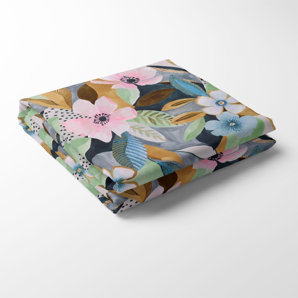 Låt Selena bordsduk bli en vacker och inspirerande del av din dukning. Det livfulla blommönstret i pastellrosa, blått och grönt mot en mörkare botten skapar en sofistikerad kontrast och ger bordet en elegant och romantisk känsla. De handmålade detaljerna i mönstret ger duken en konstnärlig och unik karaktär.