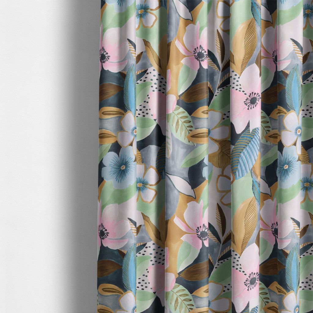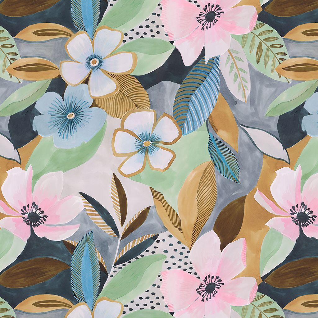 Blommönstret i mjuka pastelltoner av rosa, blått och grönt, kombinerat med inslag av guldgult och grafiska detaljer, skapar en trendig och elegant look. Tillverkat i ekologisk bomull, är detta tyg en stilfull och harmonisk detalj i ditt hem.