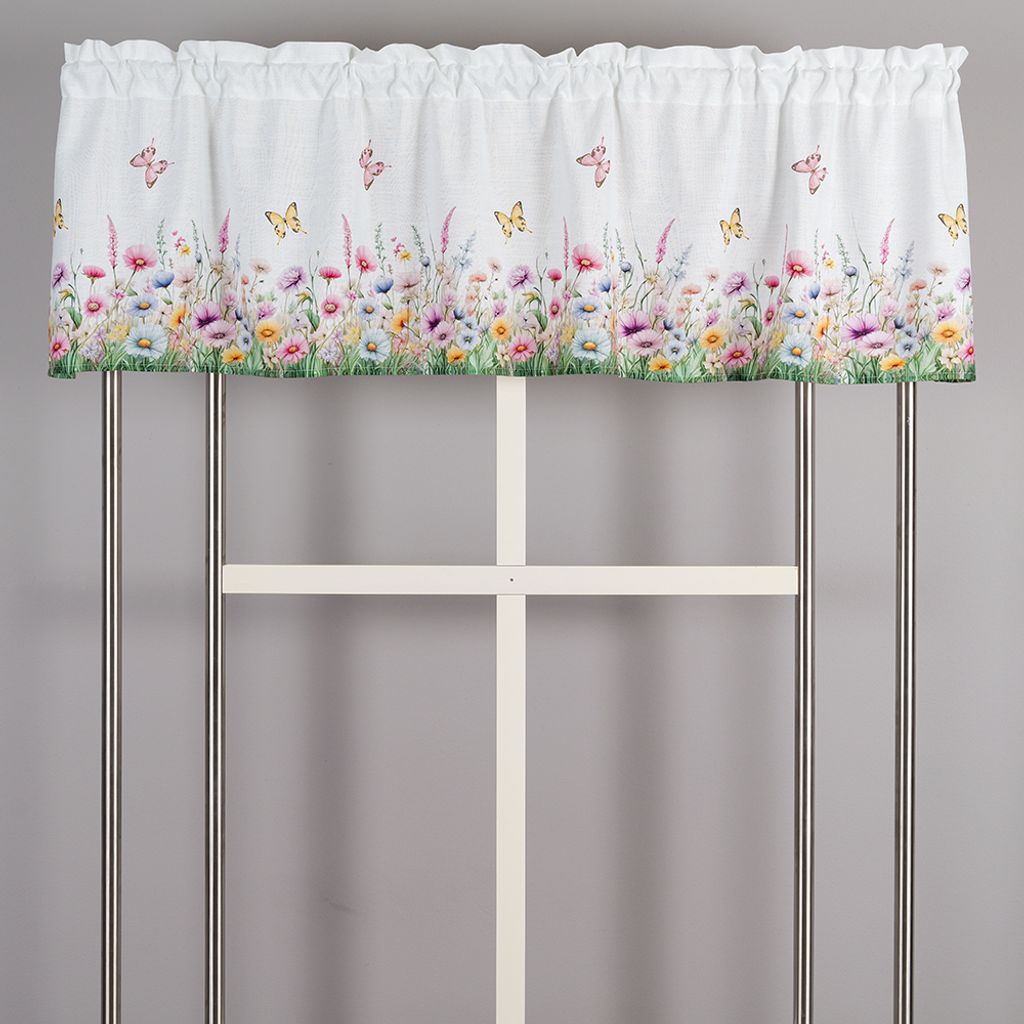 Selma kanalkappa metervara är ett vackert och dekorativt gardintyg som förmedlar känslan av blommande sommarängar. Det detaljrika mönstret med färgstarka blommor och små fjärilar löper längs nederkanten och skapar ett luftigt, levande uttryck samtidigt som den övre delen hålls ljus och lugn.