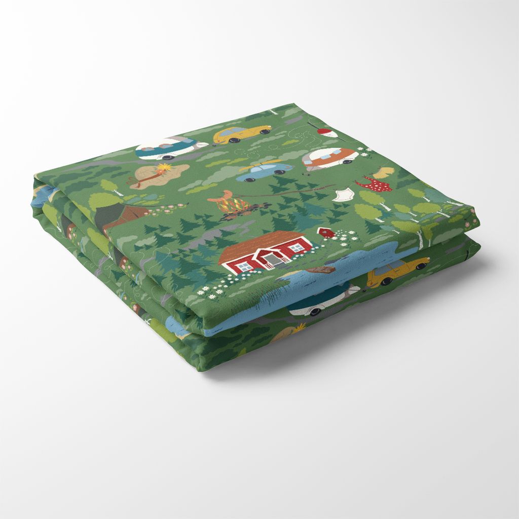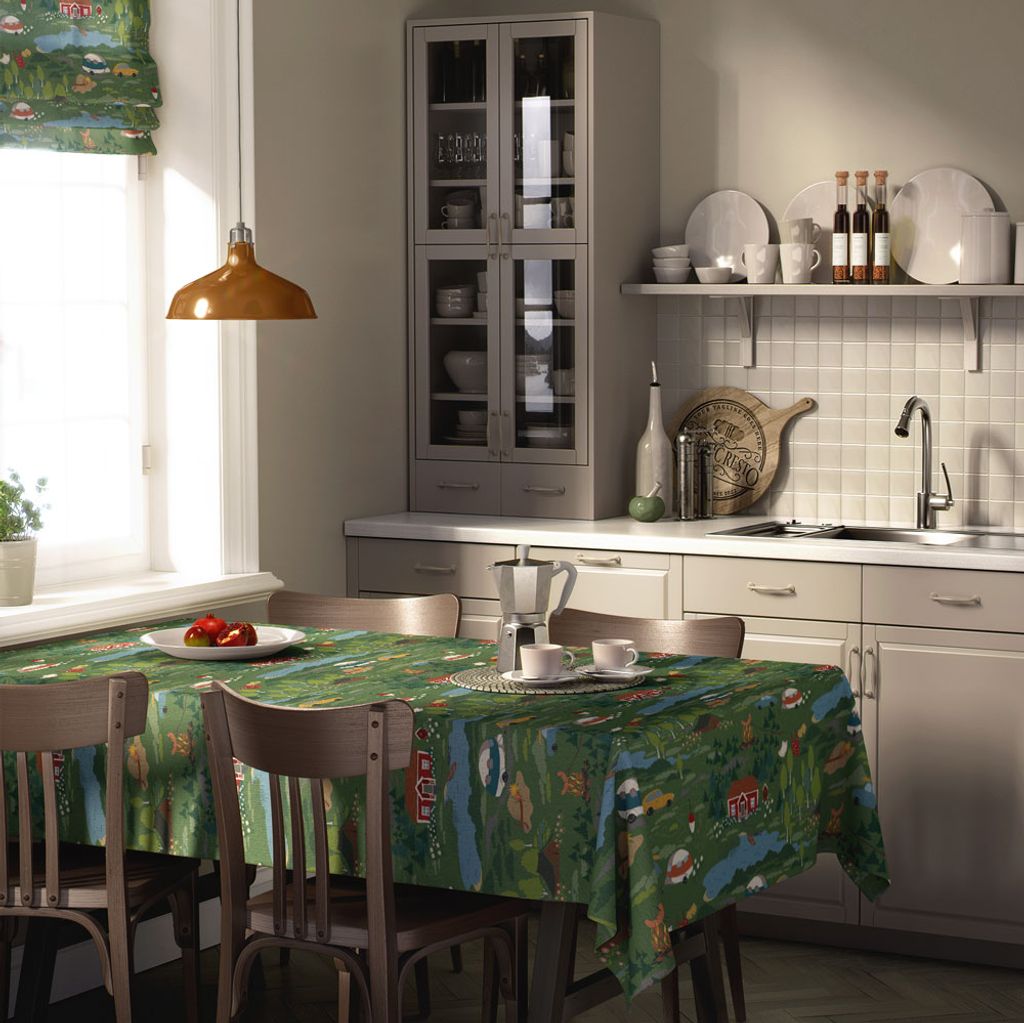 Semester grön bordsduk har ett charmigt retroinspirerat mönster som skildrar somriga landskap med stugor, bilar, skog och små detaljer som skapar en berättande helhet. Den gröna botten ger mönstret ett mjukt och harmoniskt uttryck som passar perfekt i både kök och matrum.