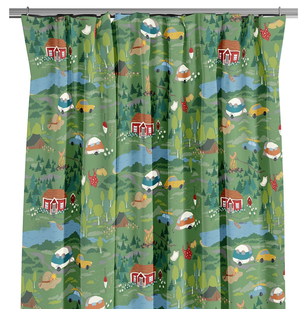 Semester grön är en lekfull gardin med ett detaljerat mönster av skog, sjöar, röda stugor och husvagnar. Ett charmigt val som skapar en varm och inbjudande känsla i rummet, perfekt för både barnrum och sommarstuga.