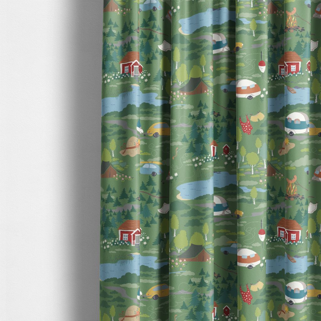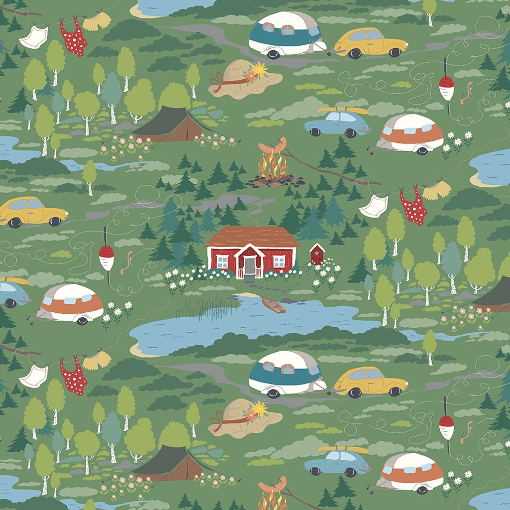 Semester grön är ett mönstrat tyg med ett lekfullt motiv inspirerat av sommar, natur och campingliv. De små illustrationerna breder ut sig över en grön botten och skapar en varm och levande känsla.