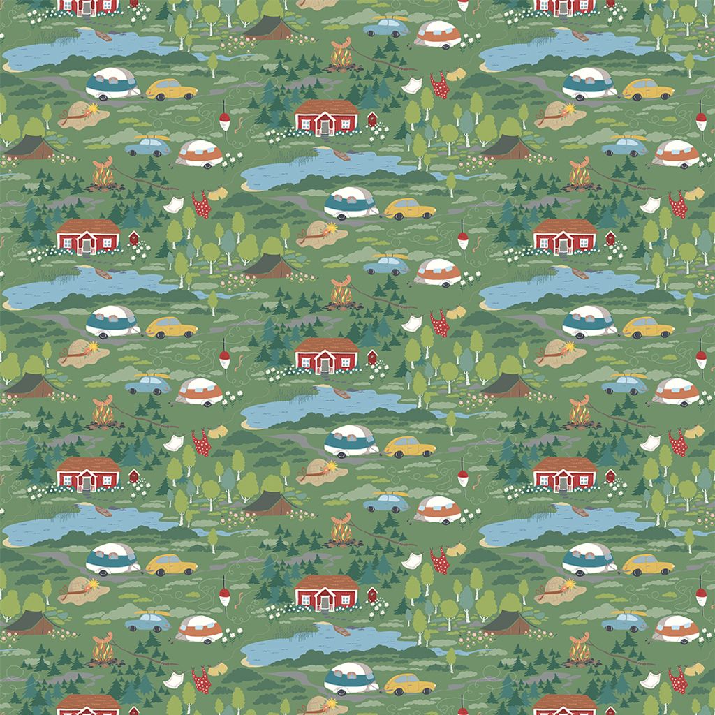 Semester grön är ett berättande tyg som fångar känslan av lediga sommardagar i naturen. Mönstret består av små scener med röda stugor, tält, husvagnar, bilar, lägereldar, sjöar och skogsområden som tillsammans bildar ett sammanhängande landskap. De många detaljerna gör tyget levande och inbjudande, med nya inslag att upptäcka varje gång man ser det.