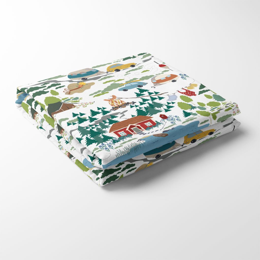 Semester vit bordsduk är designad för att ge dukningen liv och karaktär. Det retroinspirerade mönstret visar små scener av sommarlandskap, bilar, stugor och natur, vilket ger en nostalgisk känsla som passar lika bra i köket som i sommarstugan.