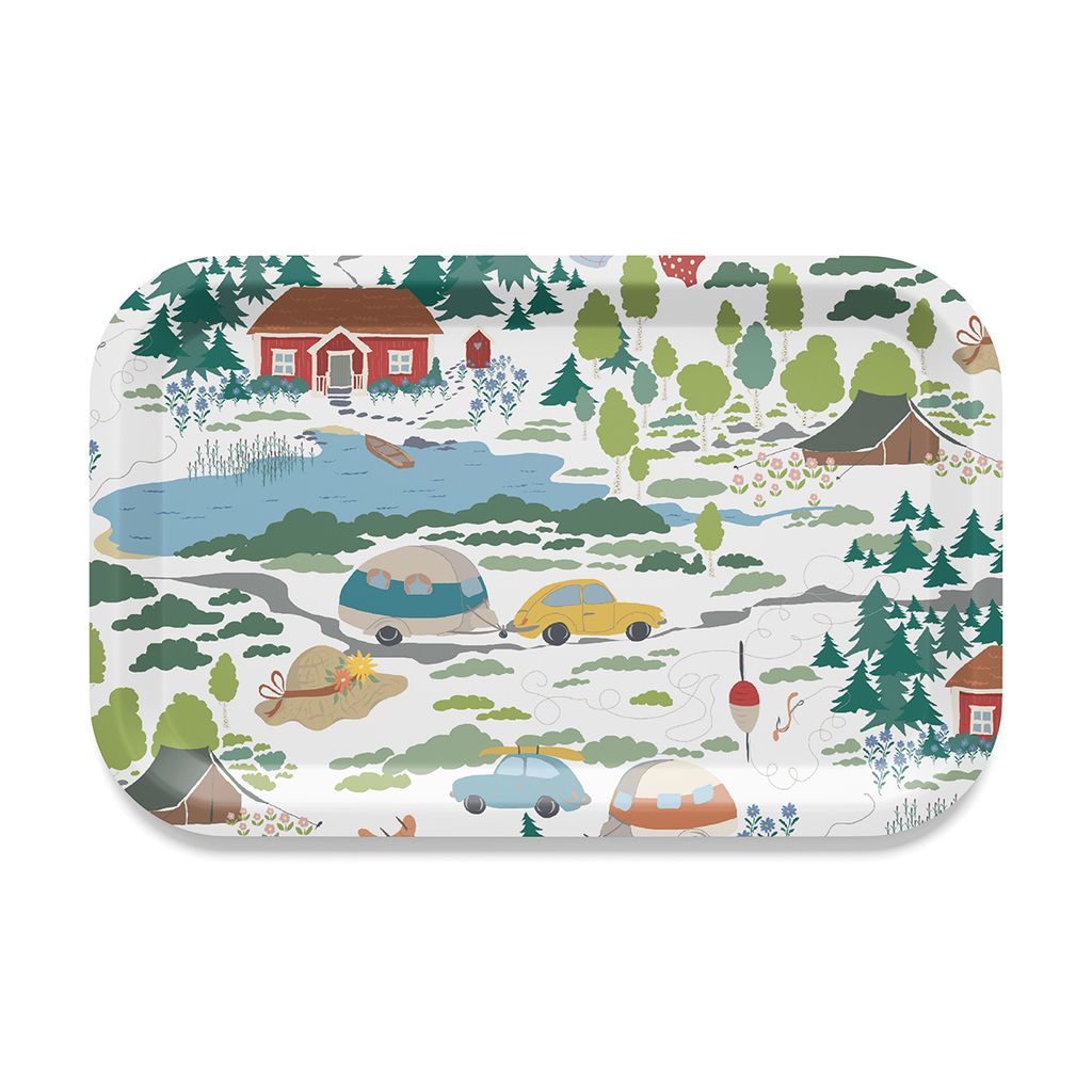 Semester vit bricka fångar känslan av svensk sommar och semester i ett detaljrikt och lekfullt motiv. Här möts röda stugor, skog, sjöar, tält, husvagnar och små bilar som slingrar sig genom landskapet – en berättelse om utflykter, campingliv och lugna dagar nära naturen. Den ljusa färgskalan och den vita bakgrunden ger brickan ett mjukt och harmoniskt uttryck.
