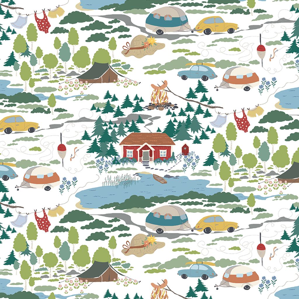 Detta kuddfodral fångar känslan av sommar och semester med ett charmigt och illustrativt motiv designat av Louise Videlyck. Mönstret visar klassiska semesterelement som husvagnar, bilar, tält, lägereld och grönskande natur. Detaljer som en hatt i solen, tvätt på lina och små stugor bidrar till en varm och nostalgisk känsla.