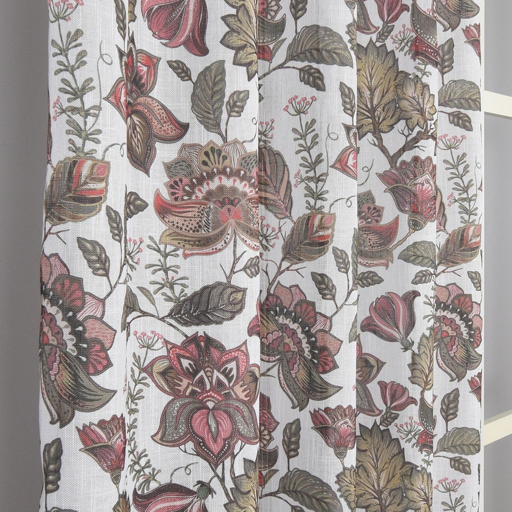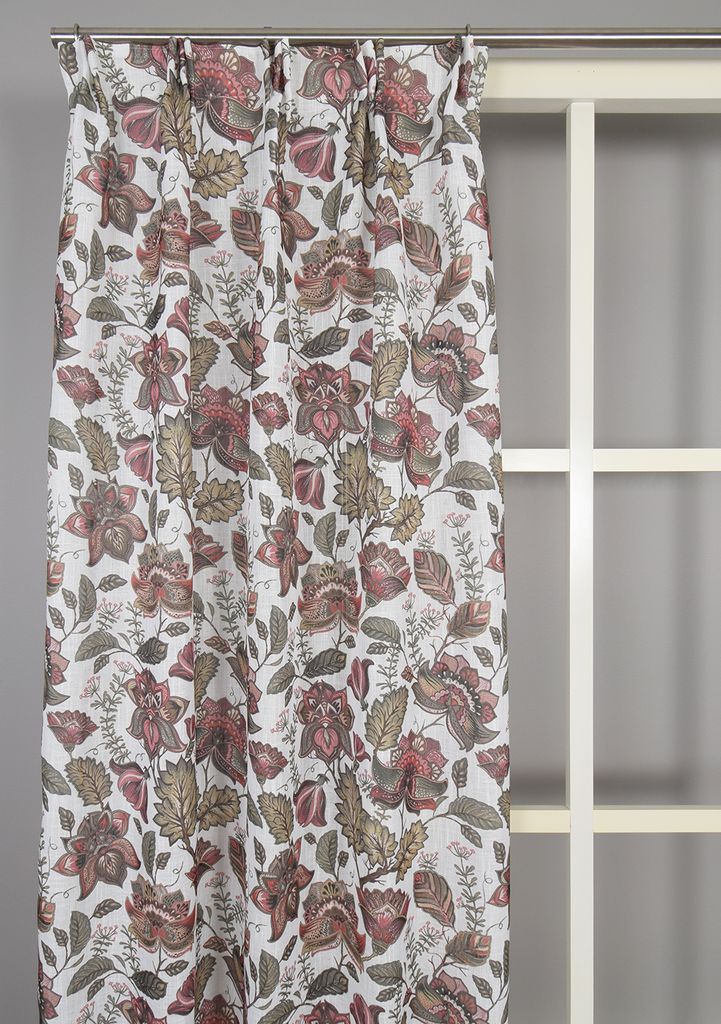 Shelly vit-rosa gardinlängder med vit botten och tryckt rosa och grönt mönster. Tygets slubeffekt skapar en levande struktur som ger gardinerna ett sofistikerat utseende.