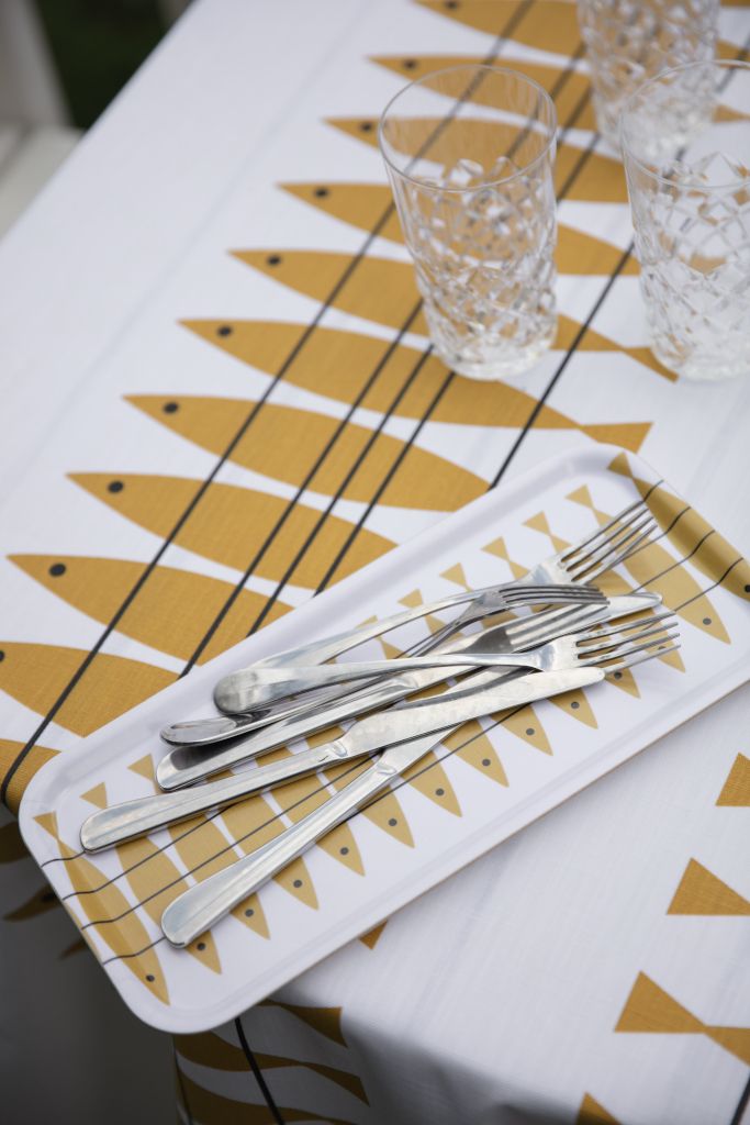 Sill bricka i färgen ockra är en stilren och praktisk serveringsbricka med ett ikoniskt mönster som sätter tonen både till vardags och fest.