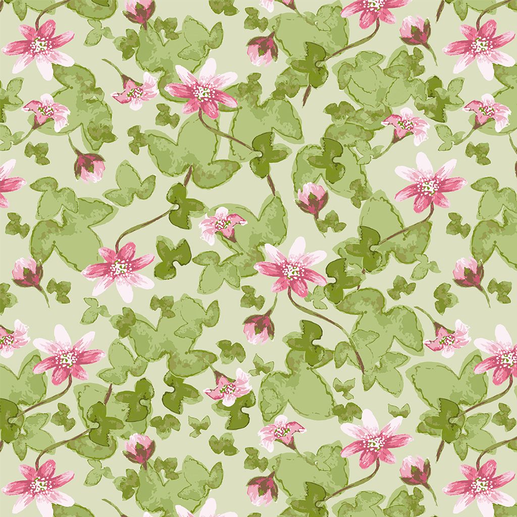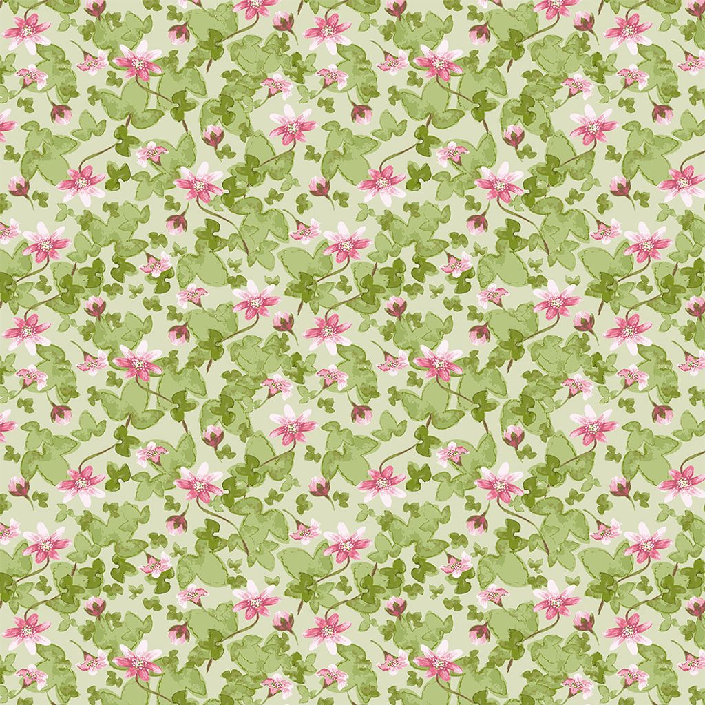 Sippa grön är ett romantiskt tyg med ett mjukt blommönster i rosa toner mot en ljust grön botten. Ett levande mönster som ger rummet en lätt och ombonad känsla, perfekt för gardiner, kuddar och andra textila projekt.