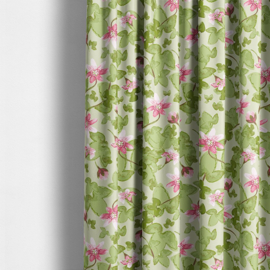 Sippa grön är ett dekorativt tyg med ett handmålat uttryck där slingrande blad och blommor skapar ett harmoniskt och levande mönster. De rosa blommorna kontrasterar mjukt mot den gröna bakgrunden och ger tyget ett tidlöst, nästan botaniskt intryck.