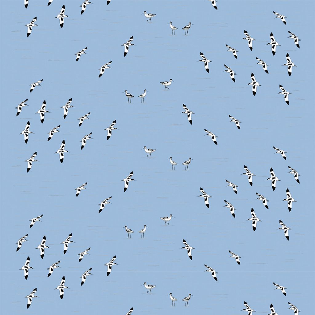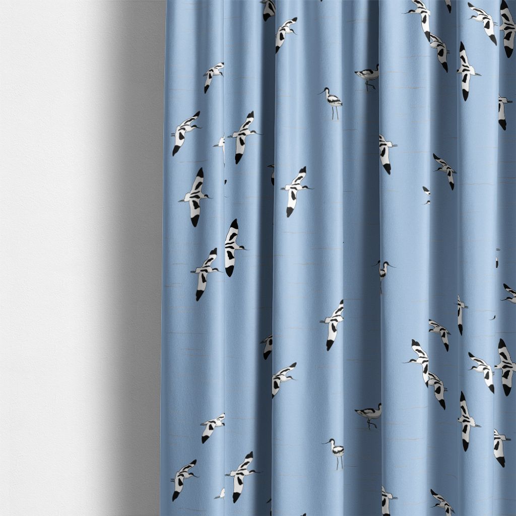 Skärfläcka ljusblå tyg är ett elegant tyg med ett subtilt och luftigt mönster av skärfläckor som flyger och står i vatten, mot en ljusblå bakgrund. Perfekt för en lugn och naturlig atmosfär.