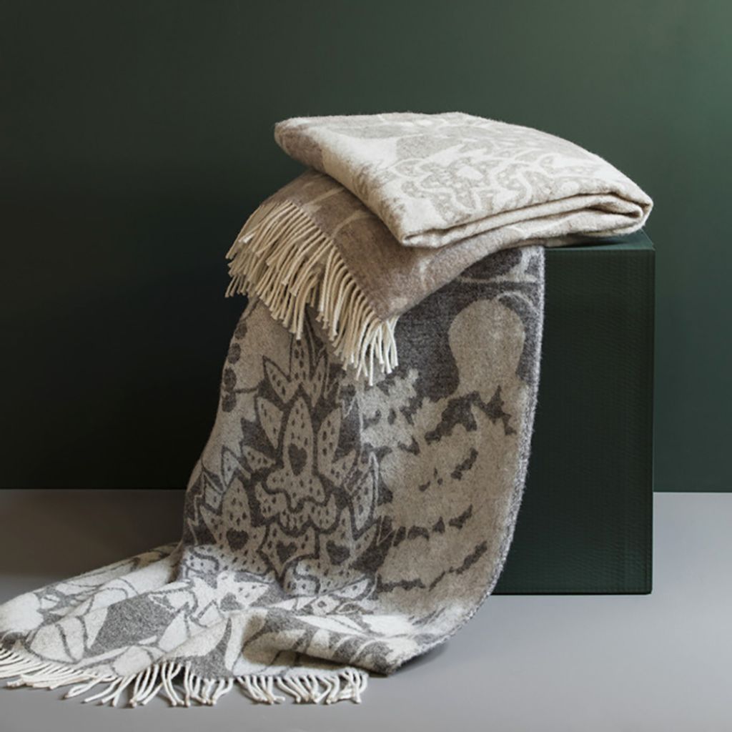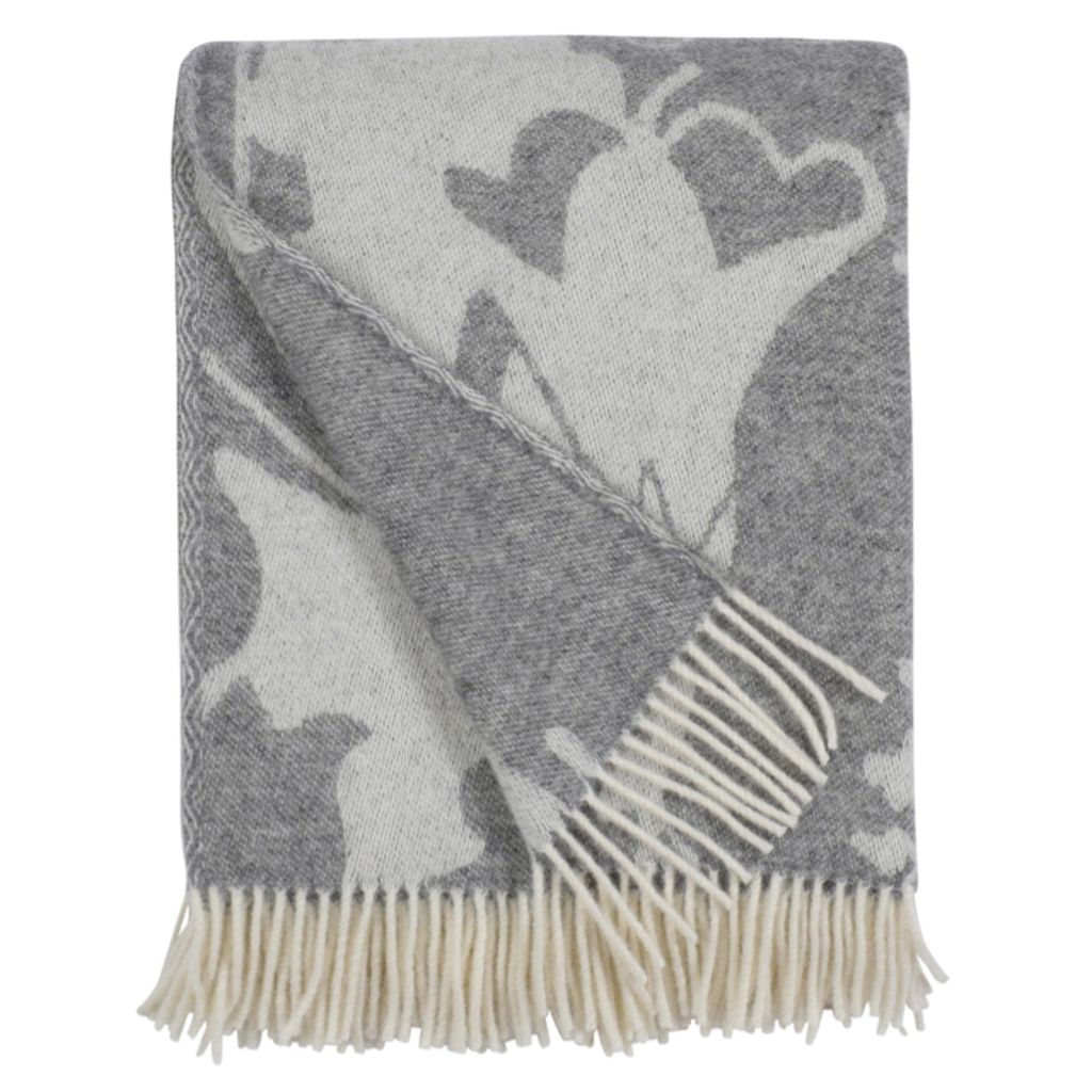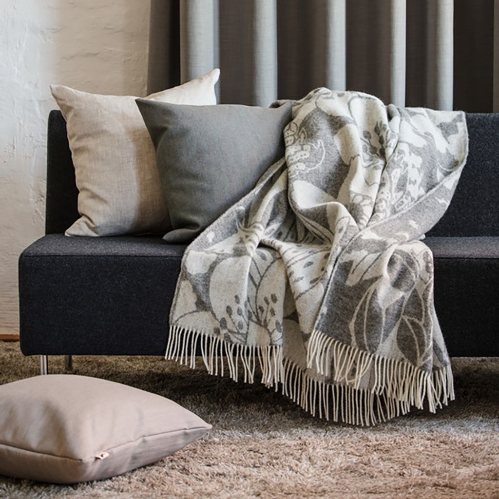 Grå och offwhite pläd med vacker mönster med blommor och blad i 100% ull.