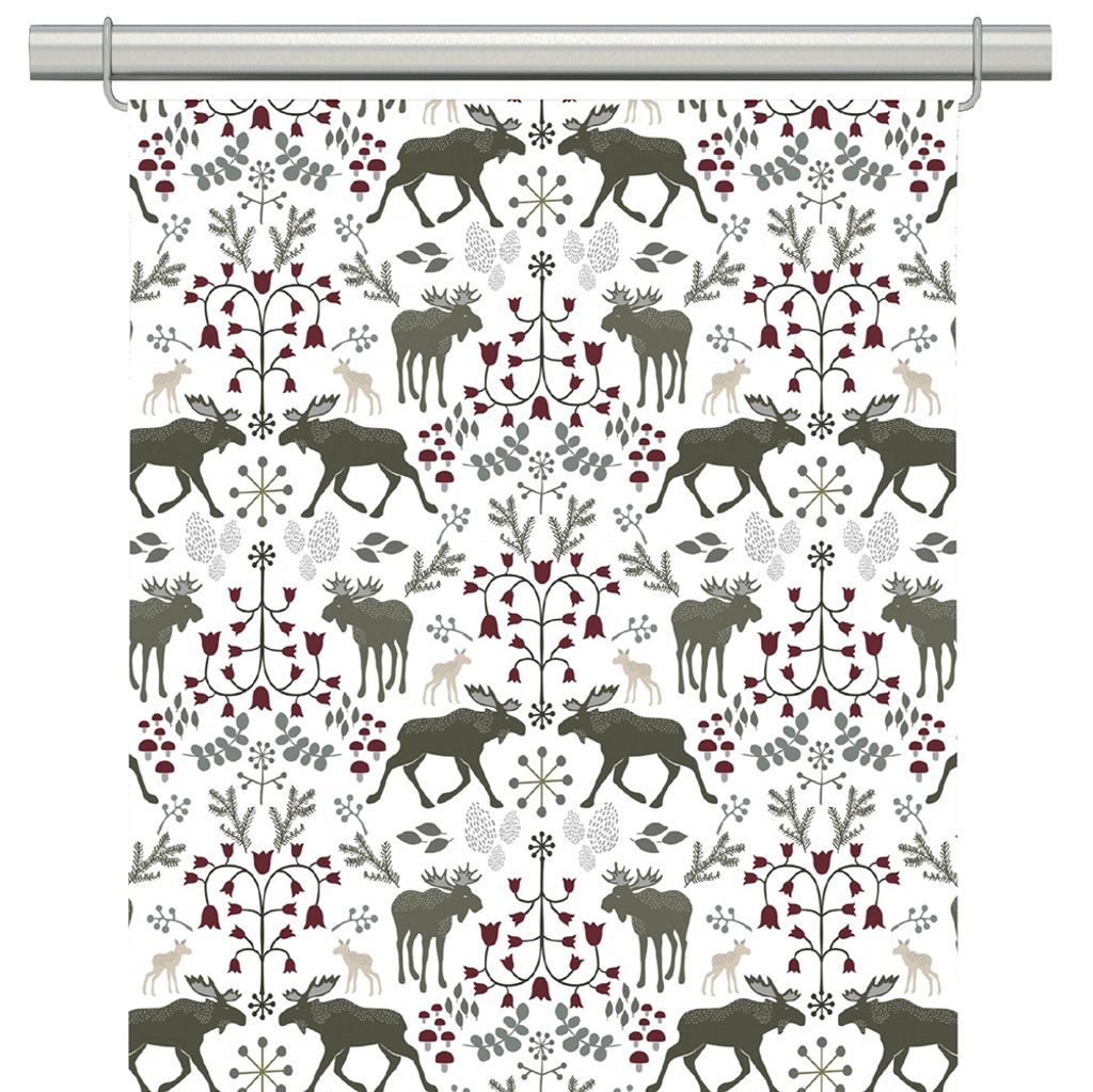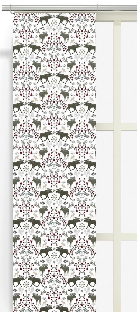 Skogens konung khaki panelgardin har ett vackert nordiskt mönster med älgar och växter i dämpade nyanser av khaki, vinrött och grått mot ljus bakgrund. En stilfull gardin som för in naturens lugn i hemmet.