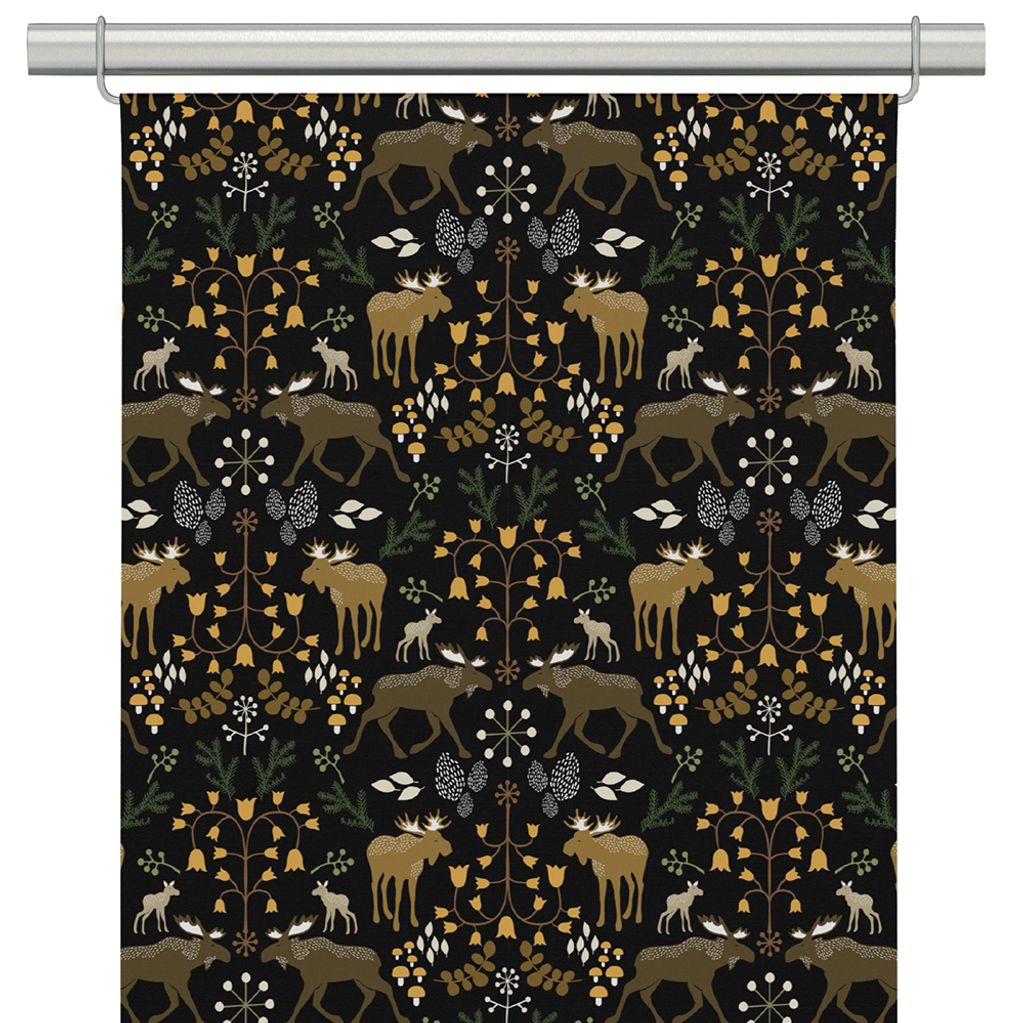 Skogens konung svart panelgardin är en hyllning till den nordiska naturens stillhet och styrka. Mönstret visar älgar och kalvar bland kottar, växter och skogsdjur i ett harmoniskt, symmetriskt arrangemang. Färgskalan i brunt, guldgult och grönt mot den svarta bakgrunden skapar ett vackert djup och en stämningsfull kontrast.