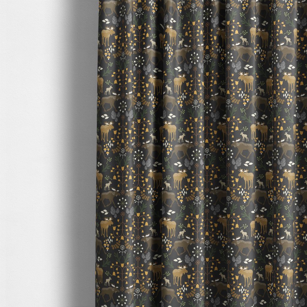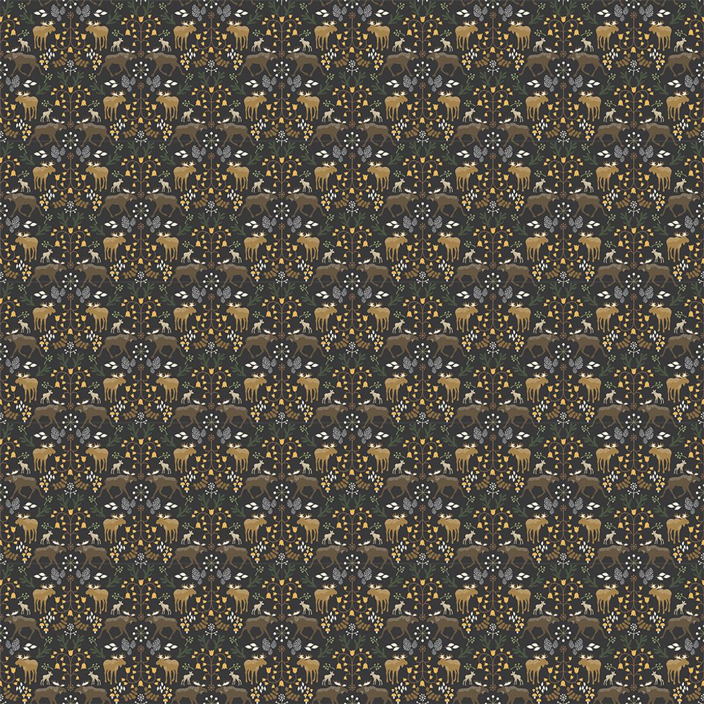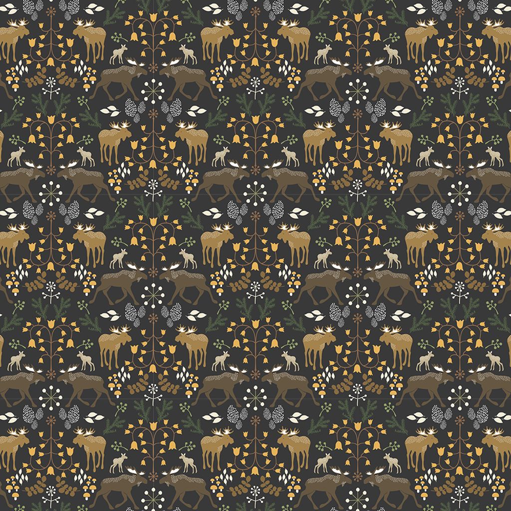 Mörk och stämningsfull bas med älgar, granar och växter – Skogens Konung svart tyg skapar en varm och naturnära känsla i hemmet.