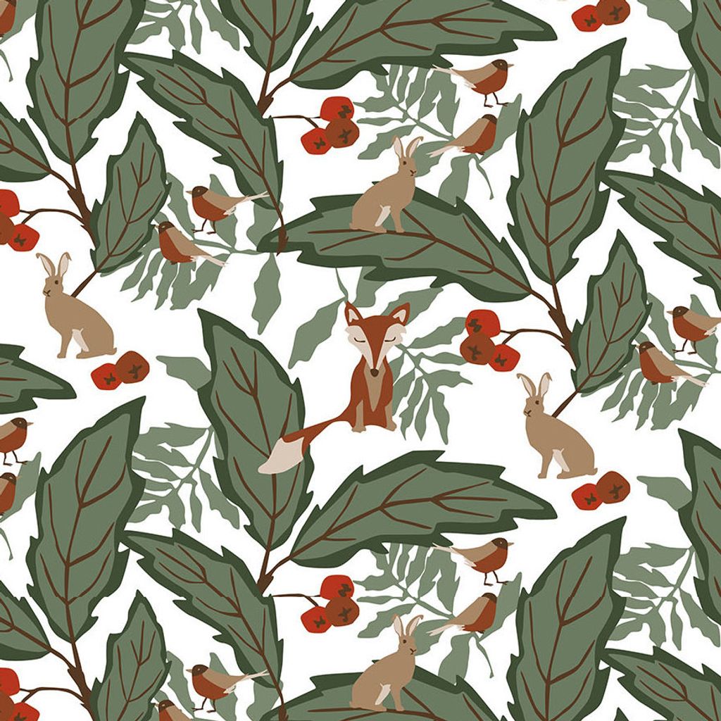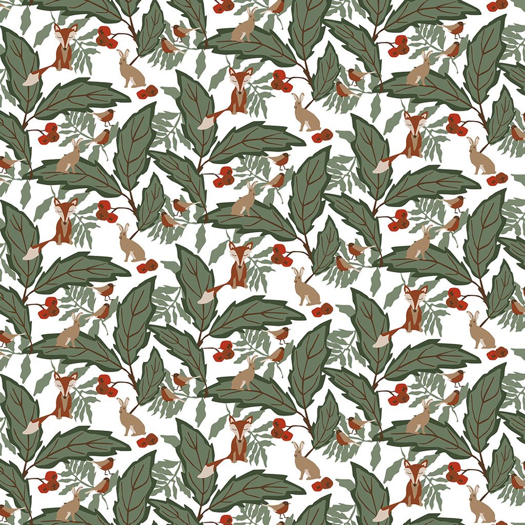Vit botten med skogs djur i gröna nyanser.