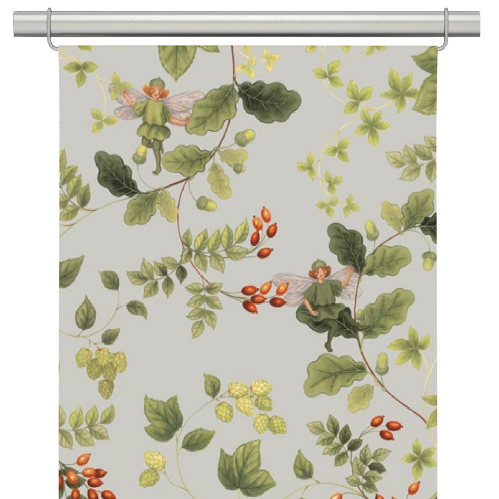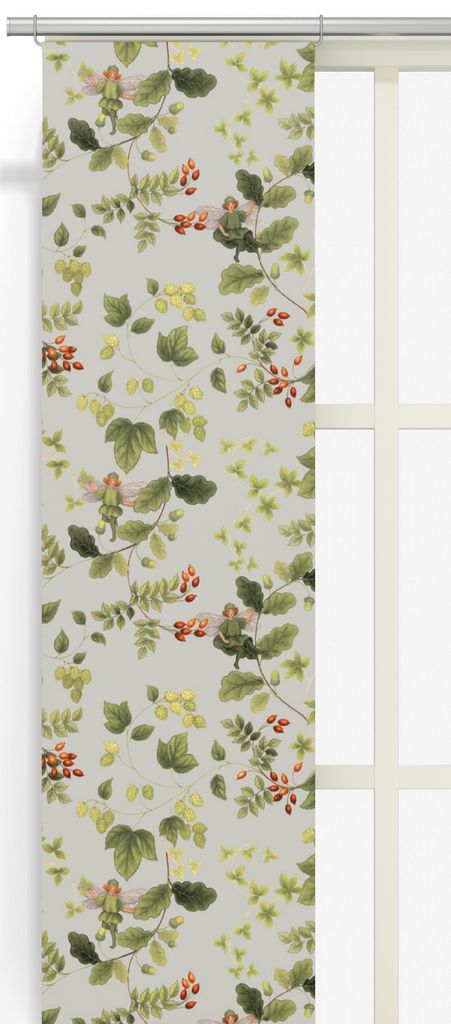 Panelgardiner med grå botten och skogsälvor och blad i grönt.