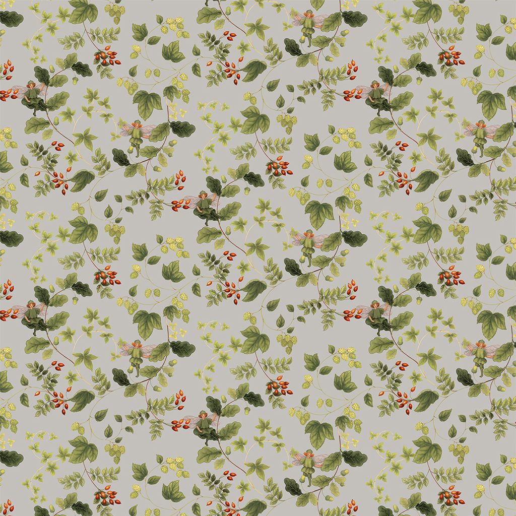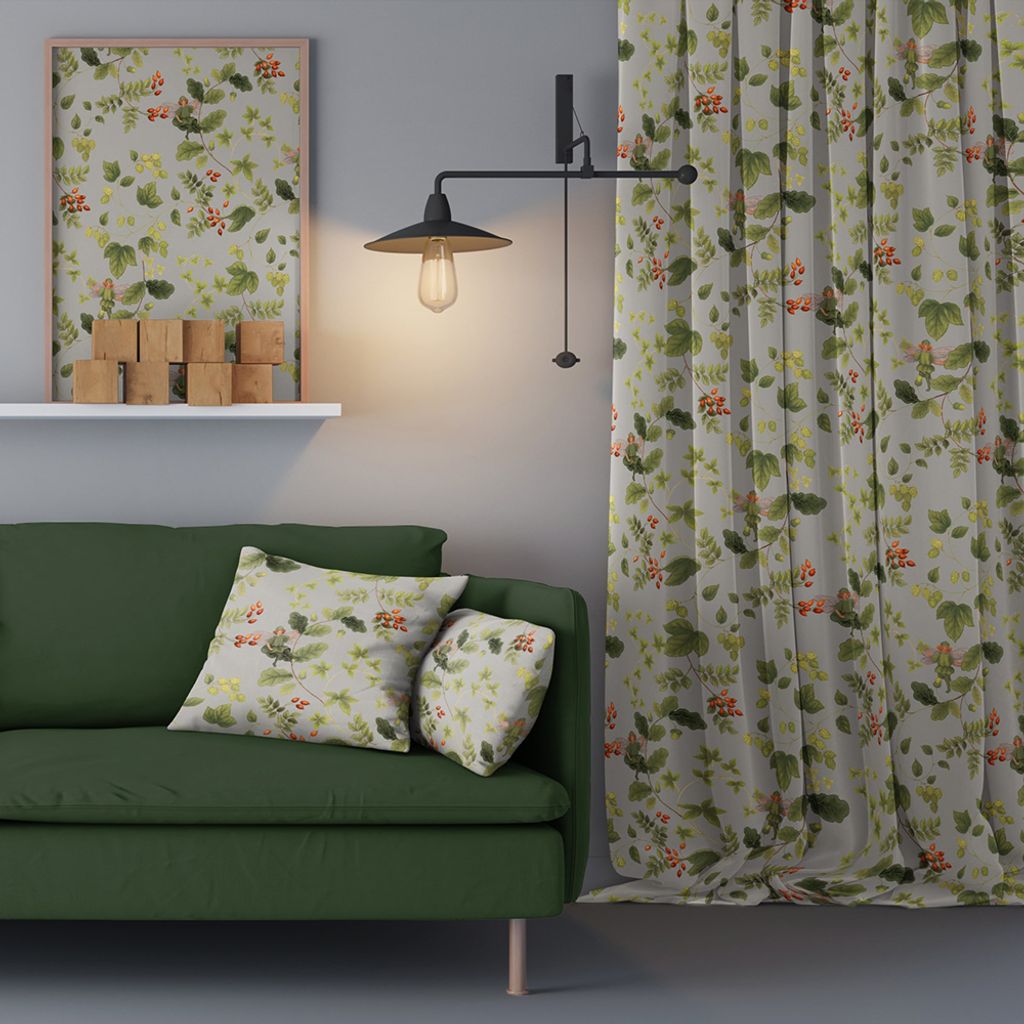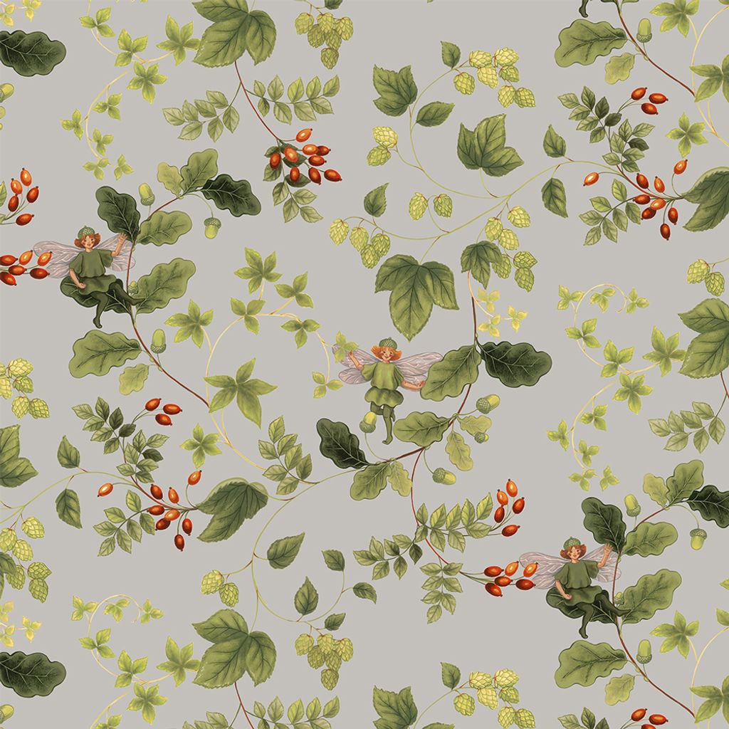 Ett gulligt mönster med älvor och grönskande växter. Mönstret är tryckt på Arvidssons klassiska bomullsvara. Passar lika bra i hemmet som på kontoret. Bild nr. 2 visar mönstret på hela tygets bredd.