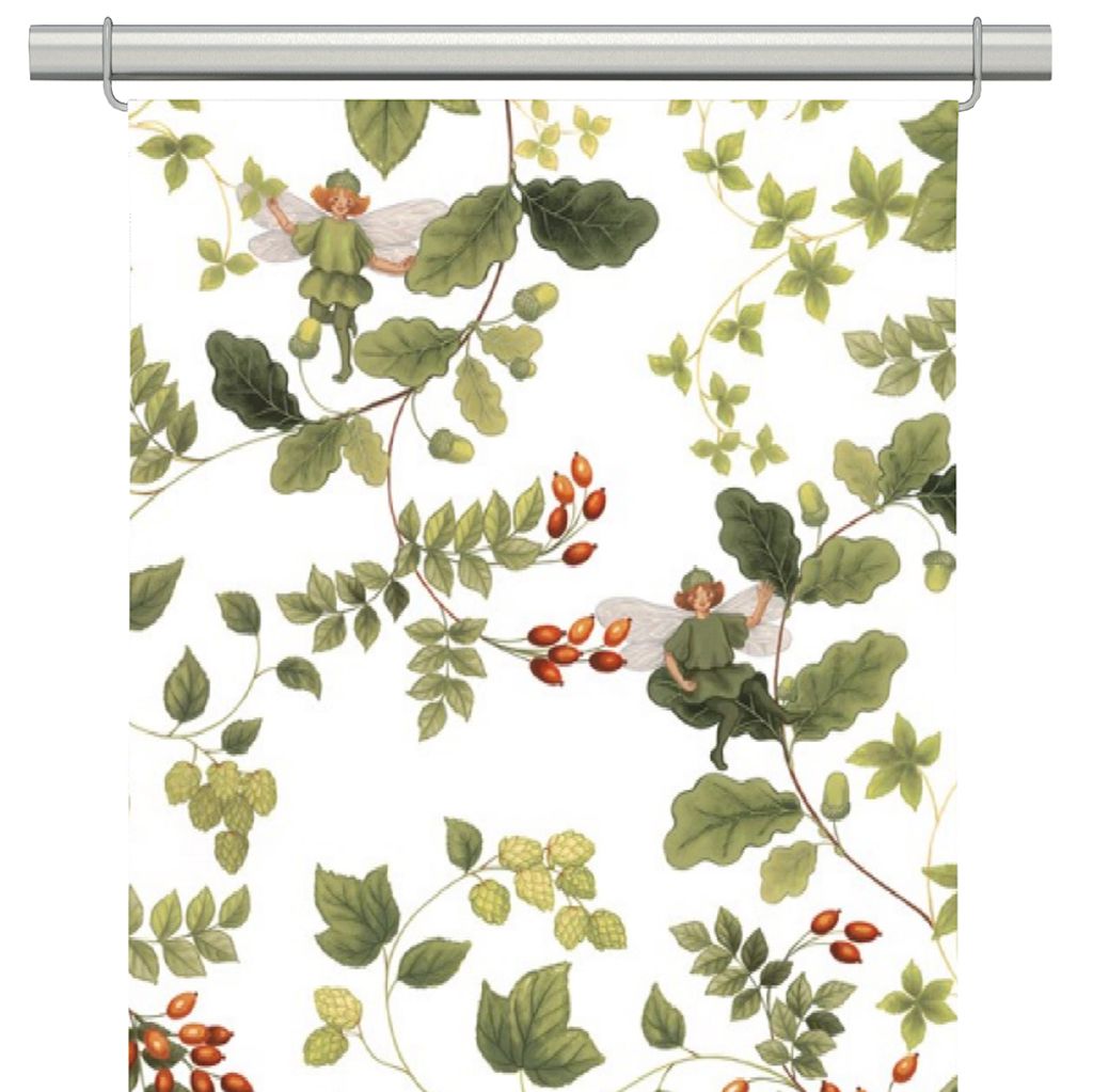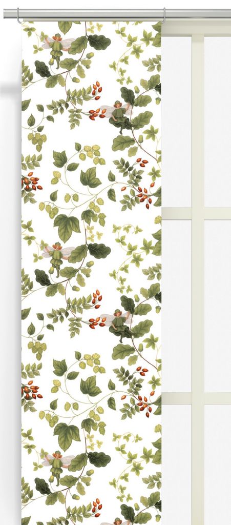 Panelgardiner med vit botten och skogsälvor och blad i grönt.