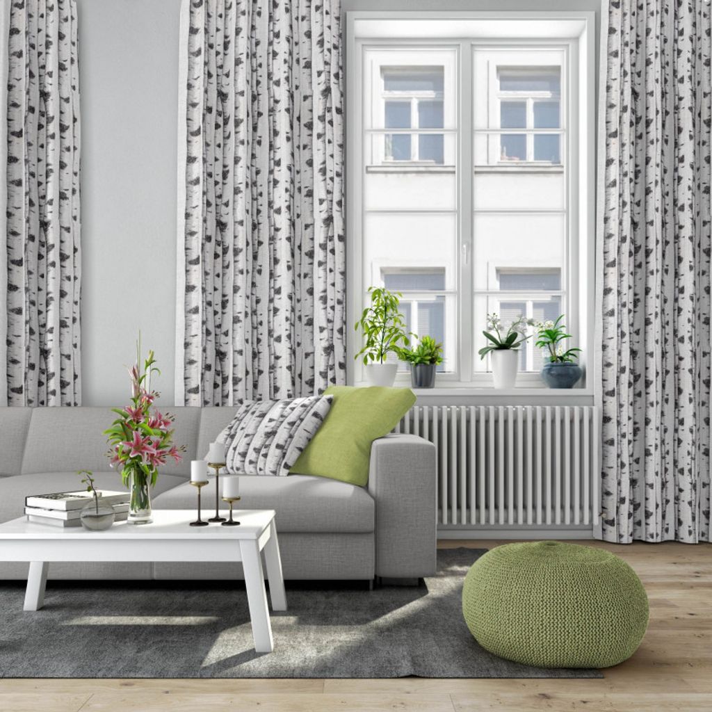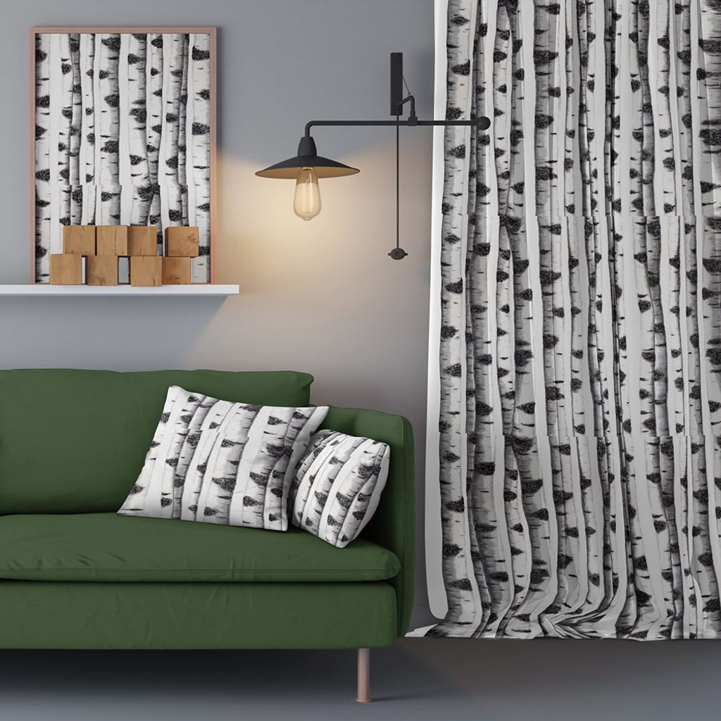Beskrivning av Skogsbryn tyg med björkstammar