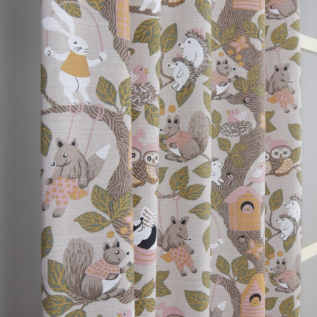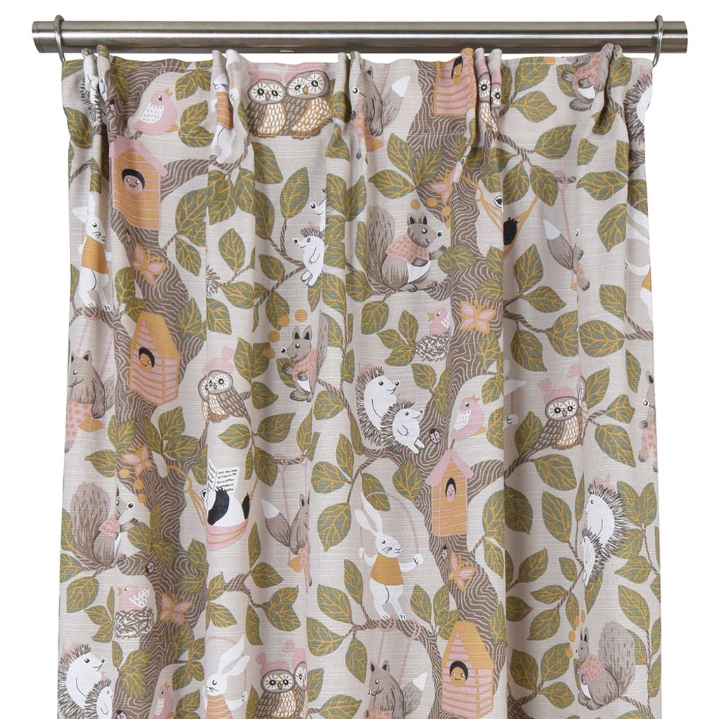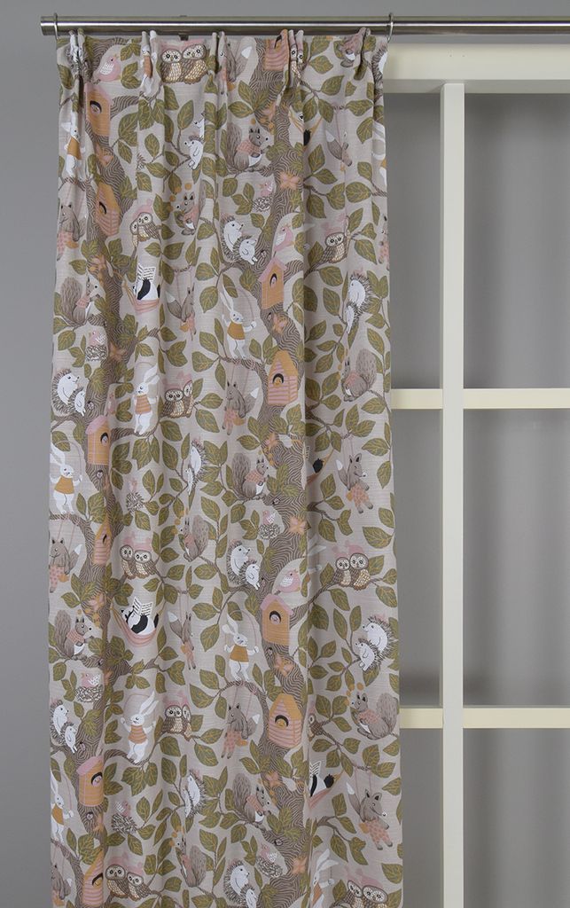 En lekfull beige gardin med skogsinspirerat motiv fyllt av djur och träd. Perfekt för att skapa en mysig och naturlig känsla i barnrum eller andra delar av hemmet.