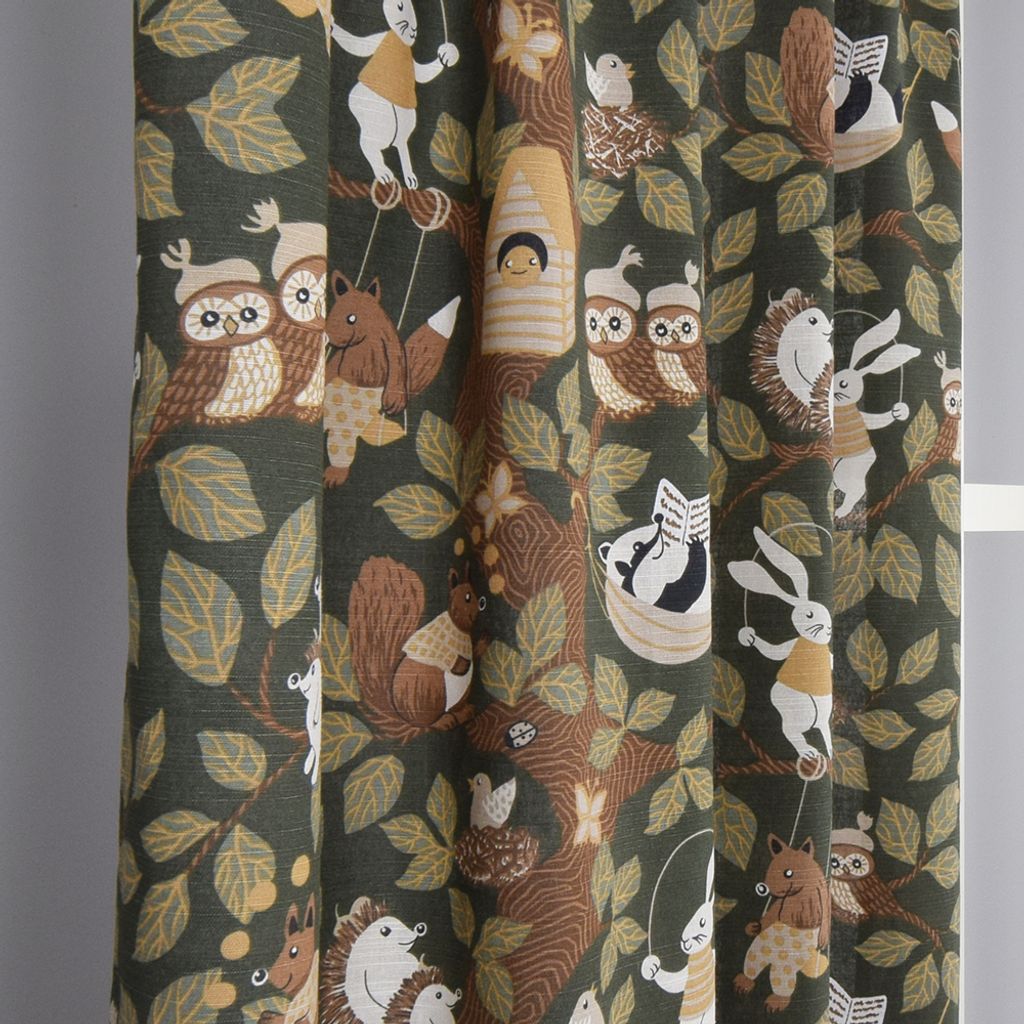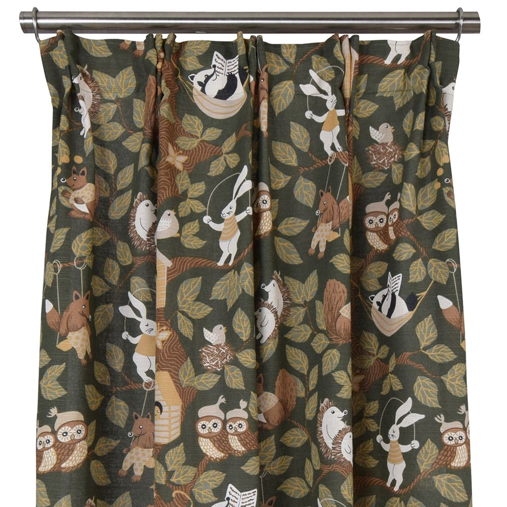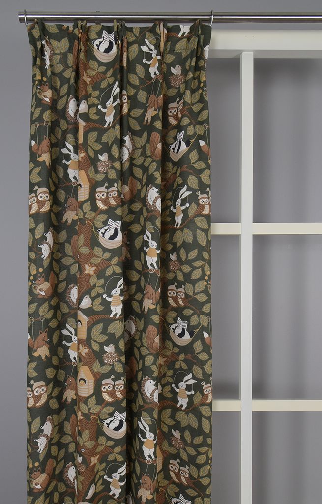 En charmig grön gardin med ett lekfullt skogsmotiv fyllt av djur och natur. Perfekt för barnrummet