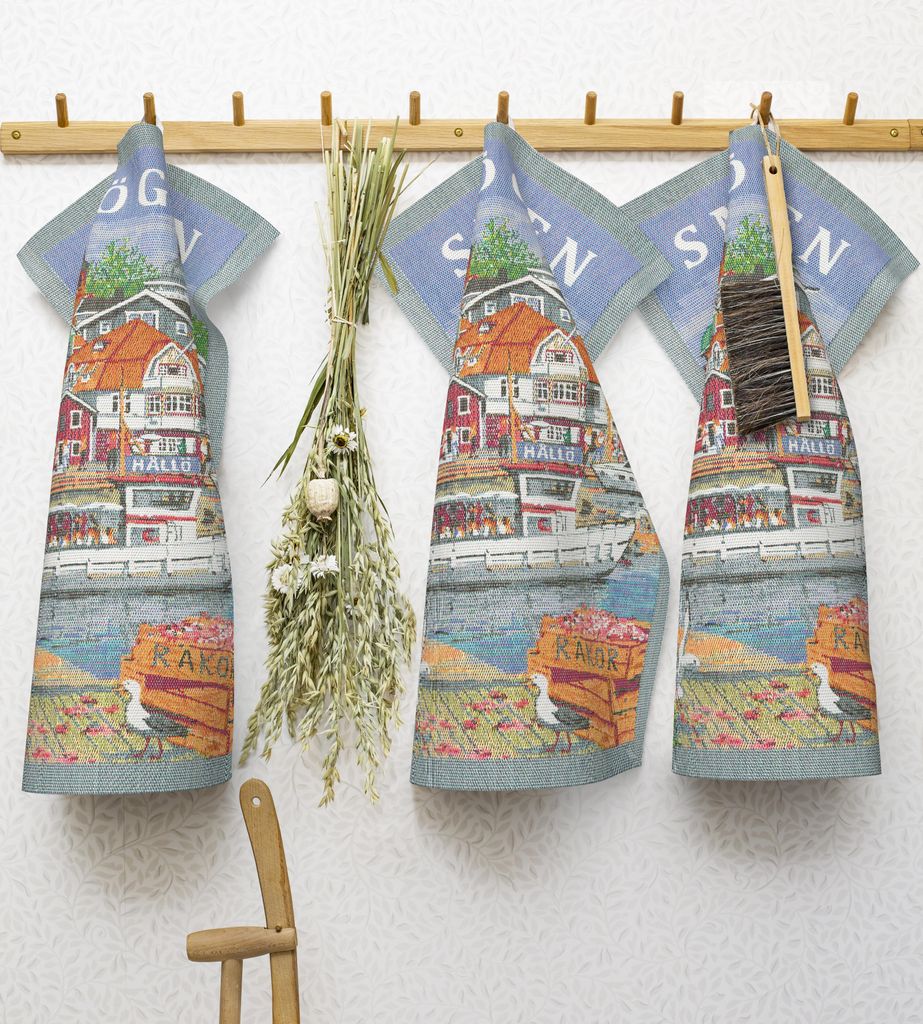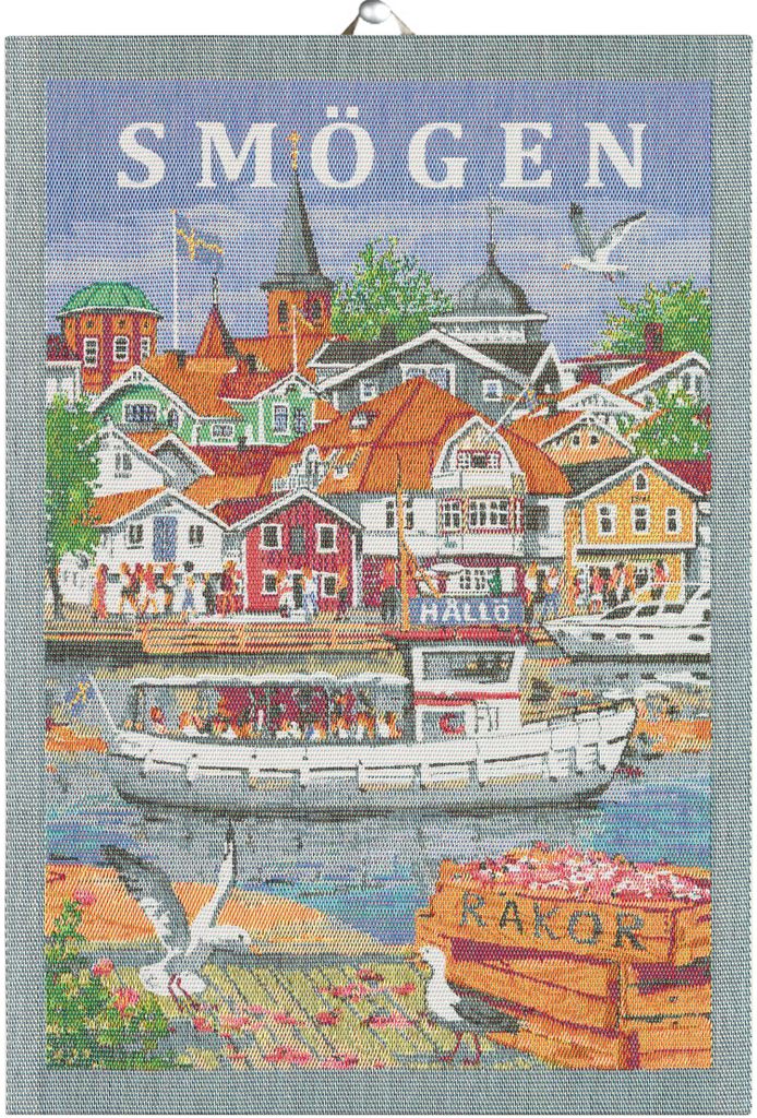Kökshandduk med motiv från Smögen i 100% Ekologisk bomull. Miljömärkta med GOTS. Tillverkad i Sverige