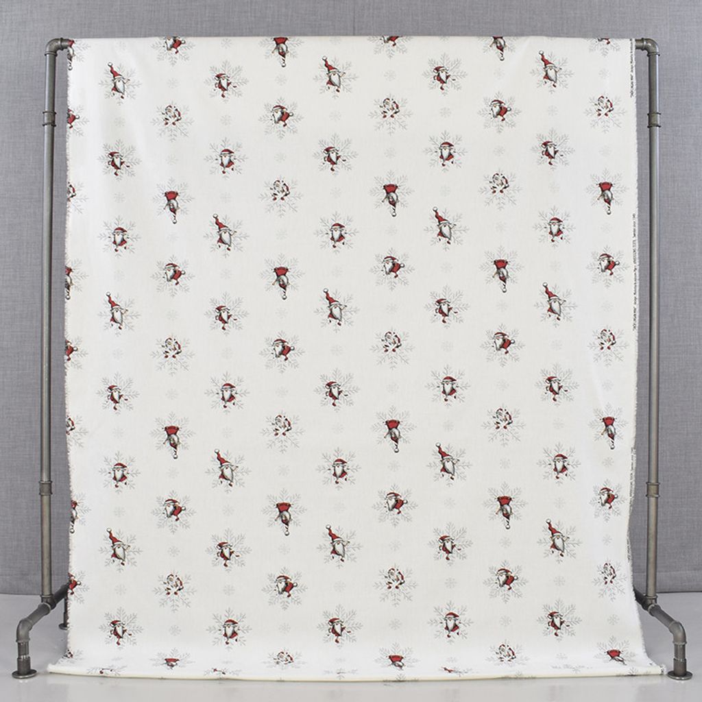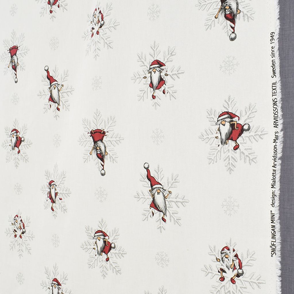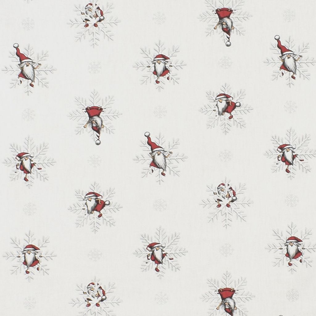 Tyg med tomtar och snöflingor med silver metallic