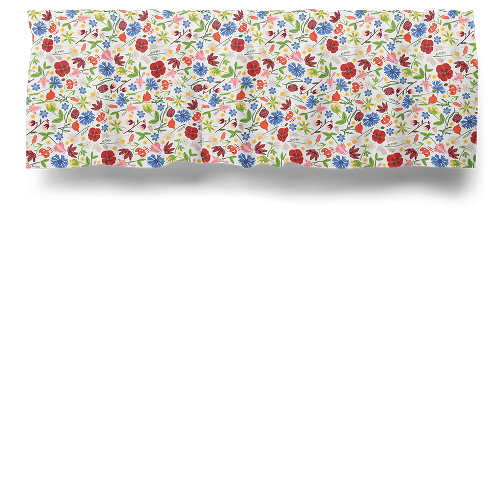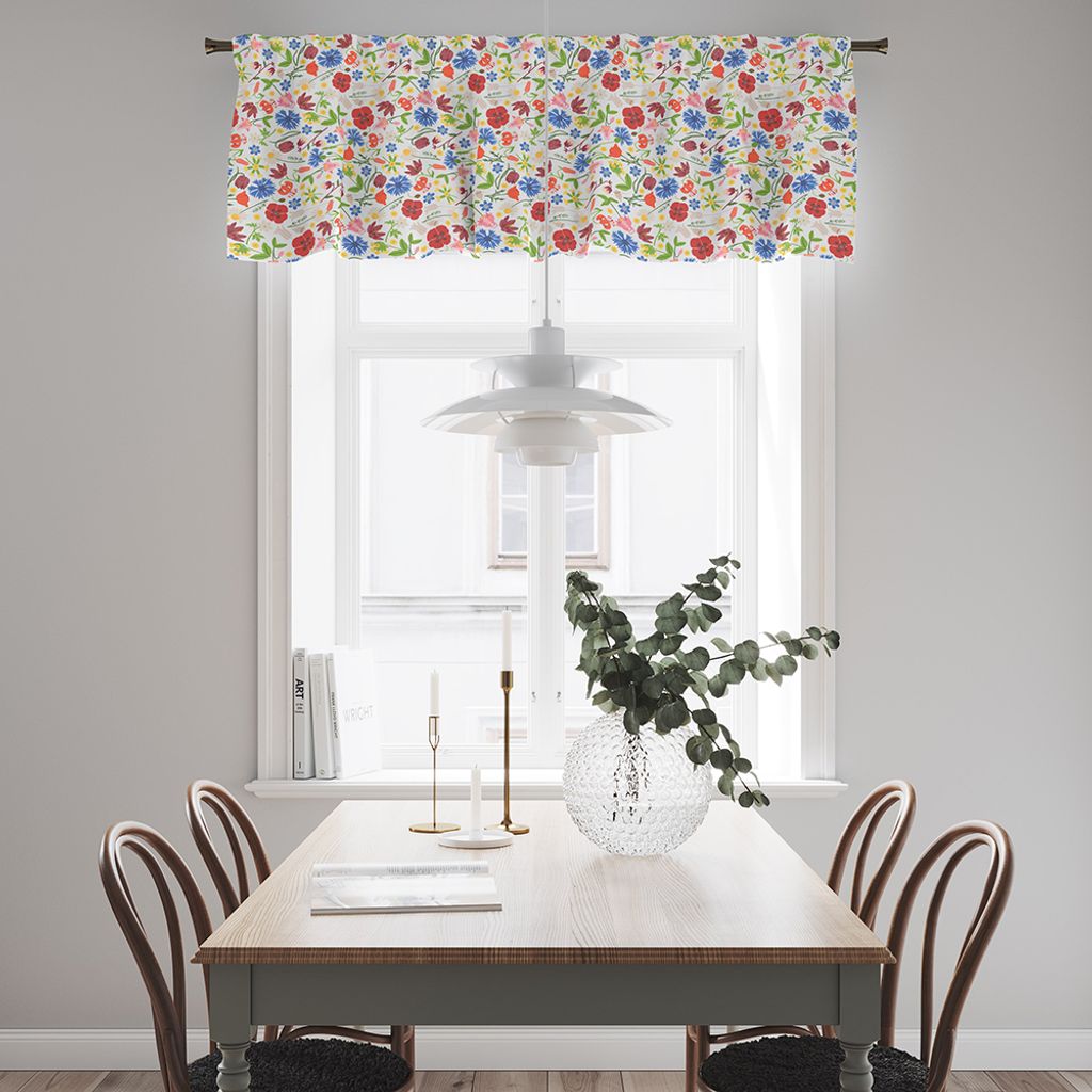 Gardinkappa på metervara med multiband och ofållade sidor. Underbart tyg designat av Edholm Ullenius med färgglada blommor och blad. Kappan är 55cm hög.