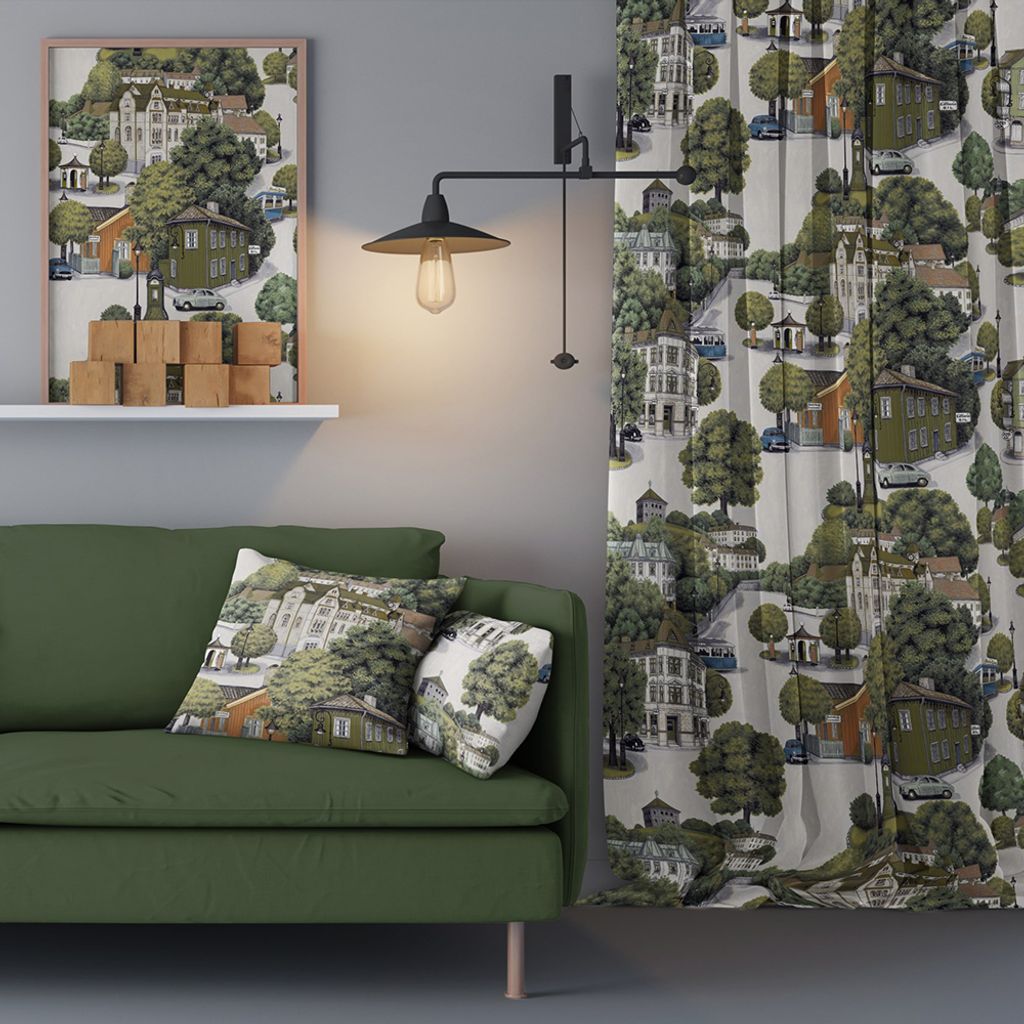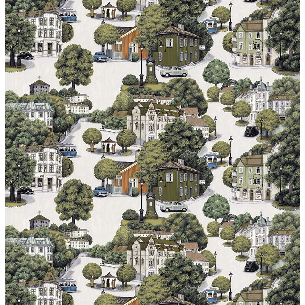 Bomullstyg med en söt stad i gröna nyanser. Mönstret är tryckt på Arvidssons klassiska bomullsvara