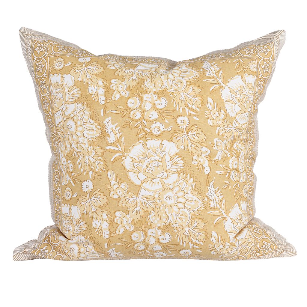 Sonia gul kuddfodral är ett dekorativt kuddfodral i 100 % bomull med ett klassiskt blommönster och elegant bård. Ett ljust och inbjudande inslag som ger rummet en varm och levande känsla.
