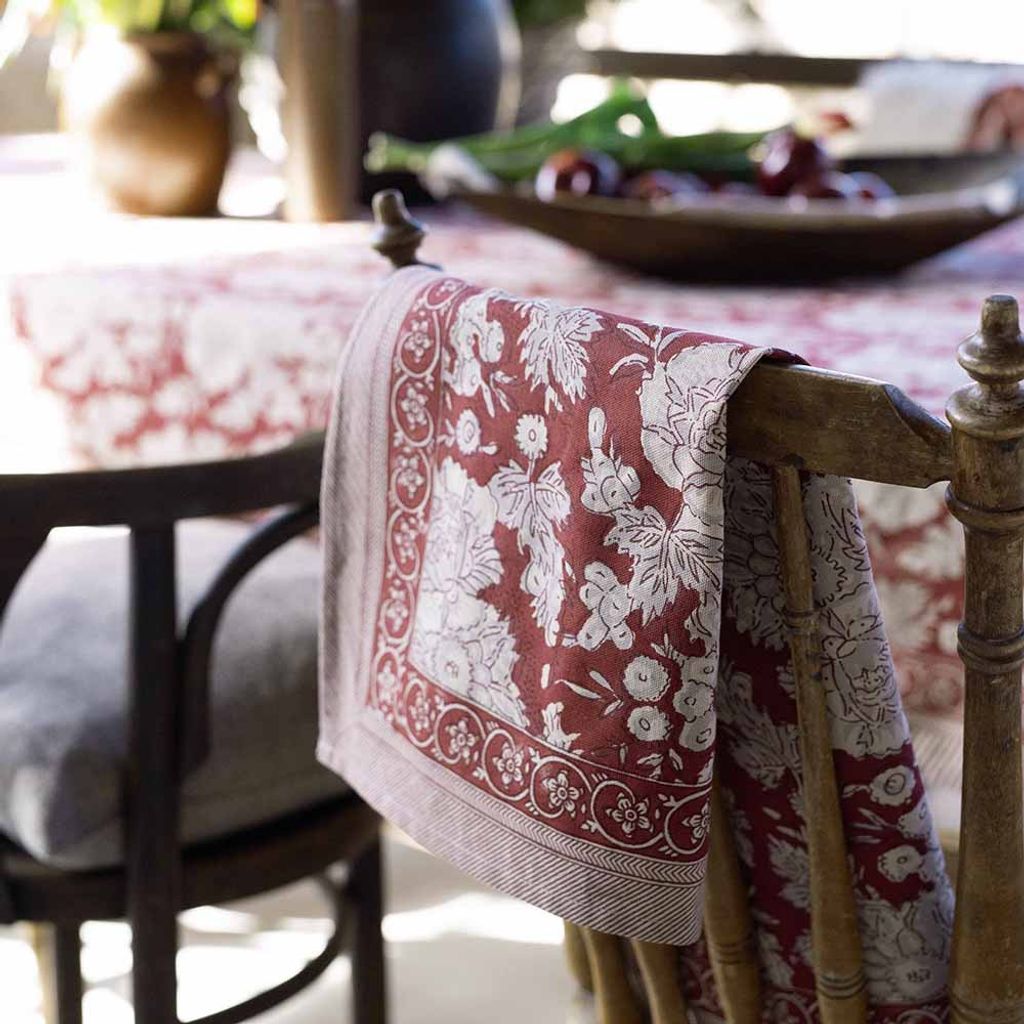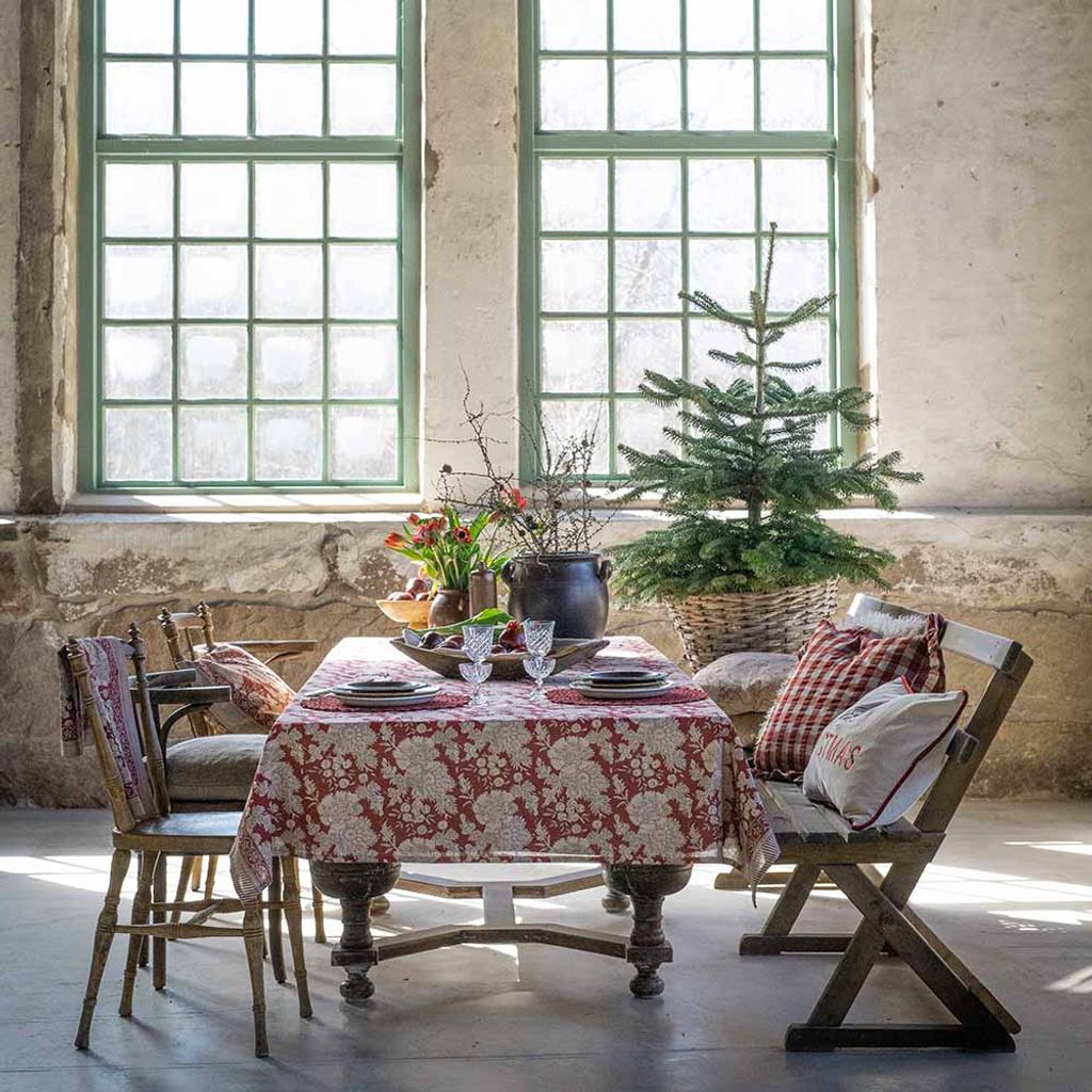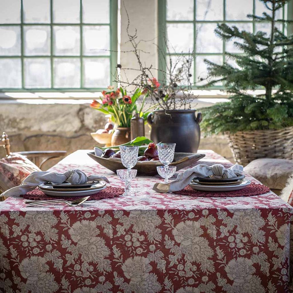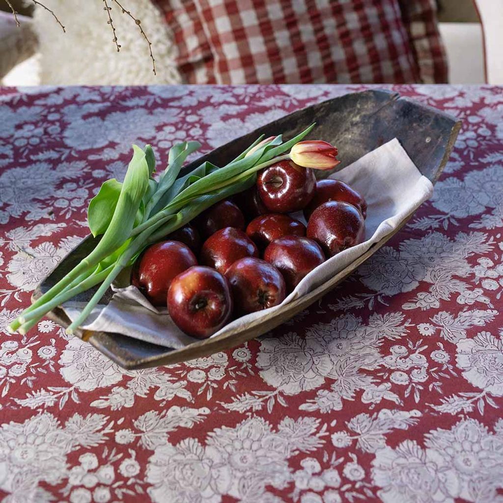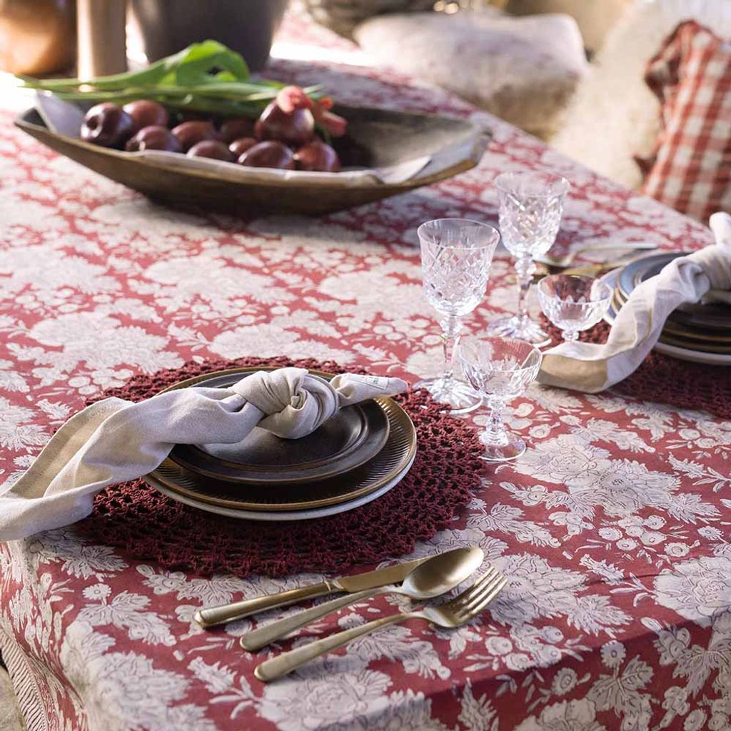 Sonia röd duk är en klassisk bordduk med blommönster och dekorativ bård i varma rödbruna toner – perfekt för såväl julbordet som en stämningsfull vardagsdukning.