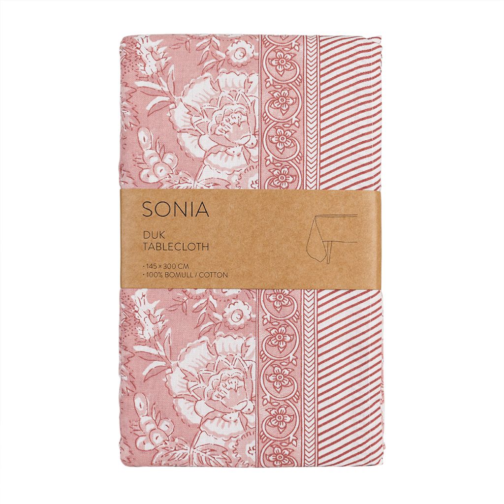 Sonia rosa bordsduk är en dekorativ duk i 100 % bomull med ett romantiskt blommönster och eleganta bårder. En mjuk och inbjudande duk som ger dukningen ett varmt och personligt uttryck.