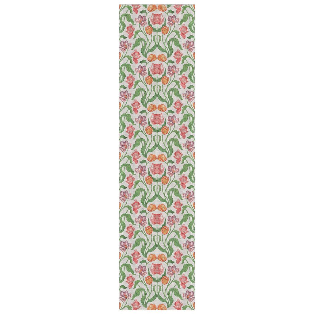 Sonja löpare pryds av ett symmetriskt och detaljrikt blommönster där tulpaner och slingrande blad skapar en harmonisk helhet. Färgskalan i grönt, rosa och varma orange nyanser ger ett tidlöst men samtidigt fräscht intryck som passar både vardagliga måltider och festligare tillfällen.