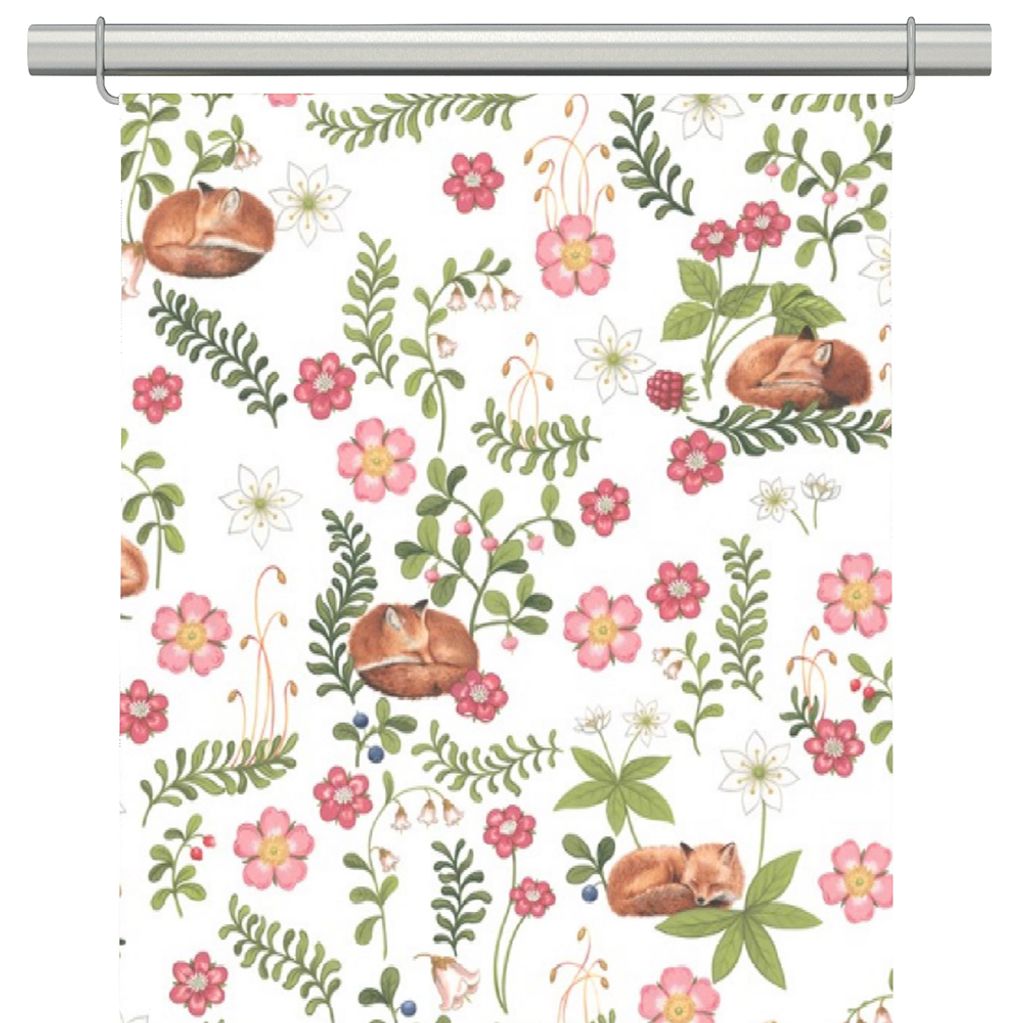 2-pack panelgardiner med offwhite botten, söta sovande rävar och blommor från Arvidssons textil.