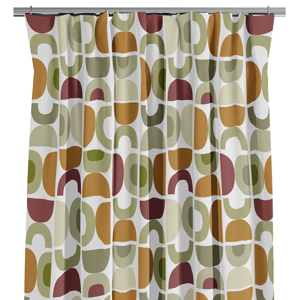 Snyggt abstrakt mönster i rost, grönt och beige från Björk Forth. Mönstret är tryckt på Arvidssons klassiska bomullsvara som hänger fint som gardiner. Ouppfållad med overlock nedtill