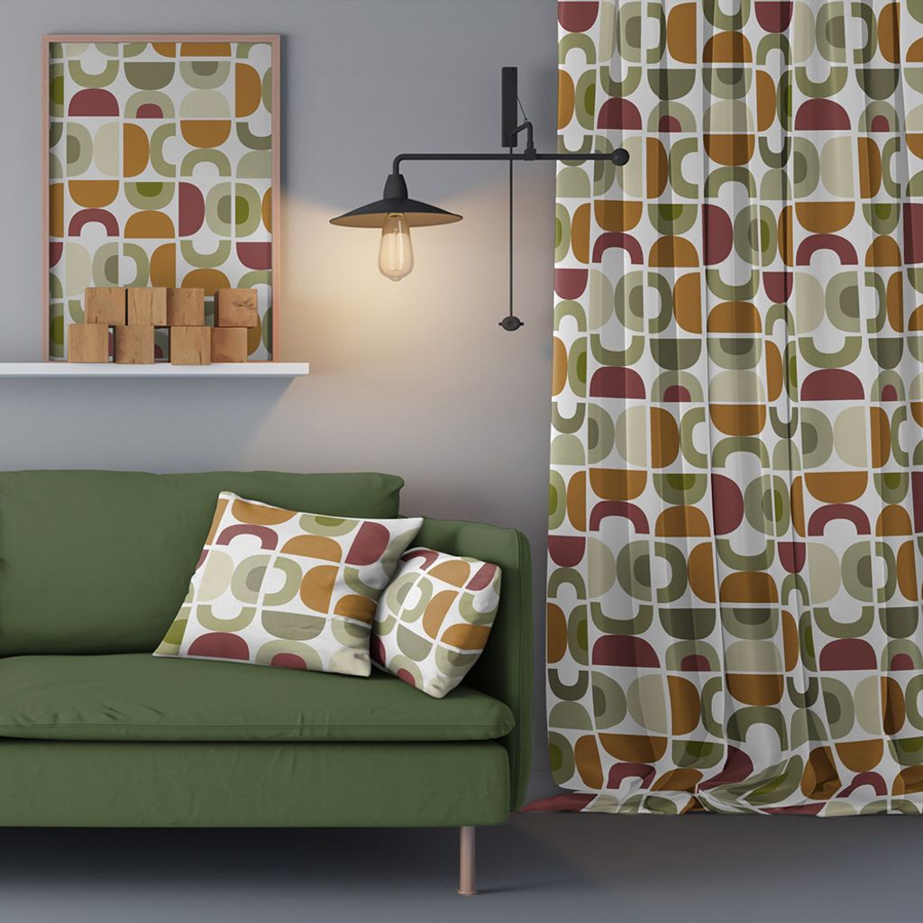 Snygga gardiner med abstrakt rost, grön och beige mönster perfekt till kontorsgardiner, vardagsrumsgardiner och köksgardiner.