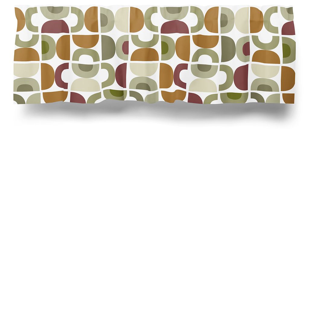 Gardinkappa på metervara med multiband och ofållade sidor. Abstrakt mönster i rost, grönt och beige från Björk Forth. Kappan är 55cm hög.
