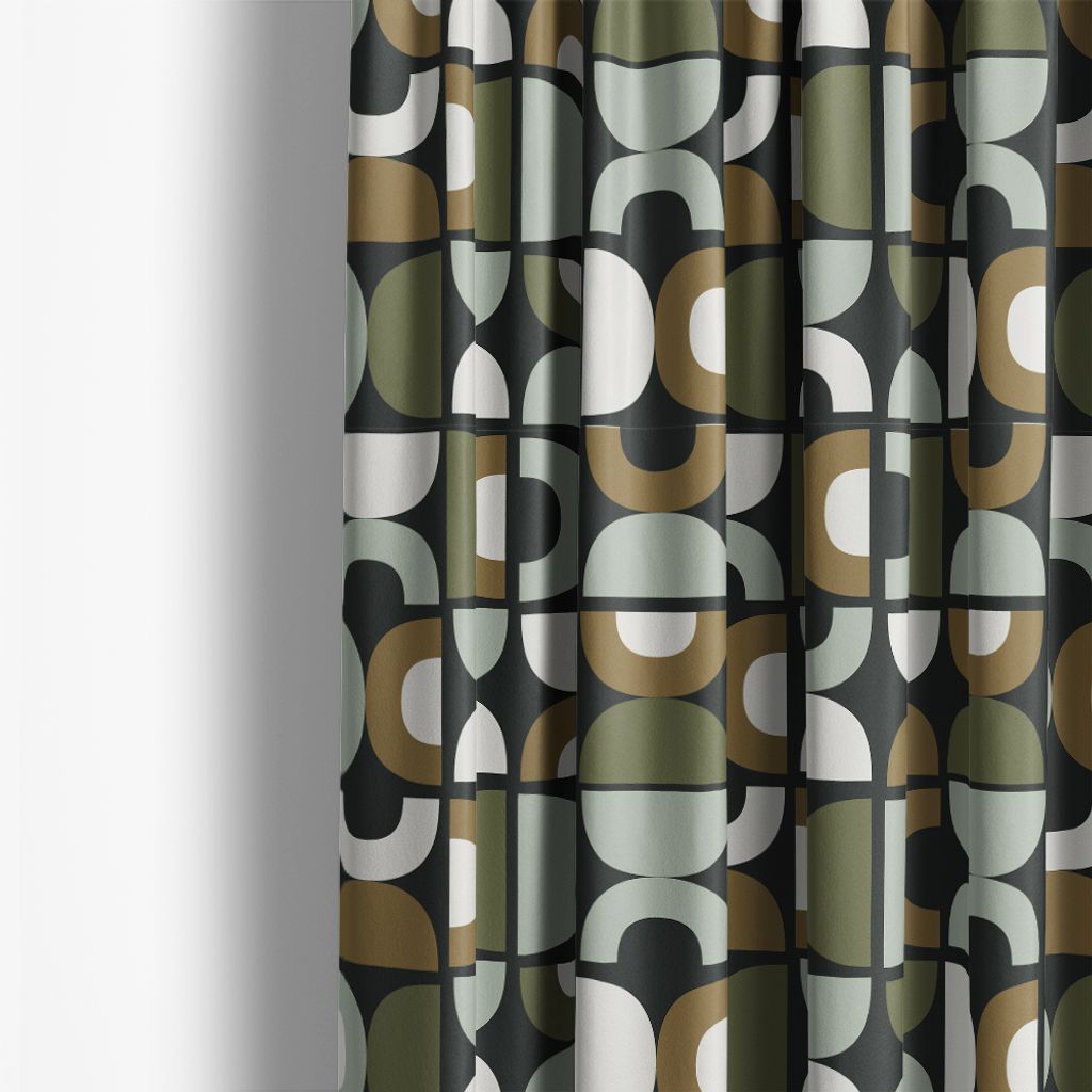Gardinerna Spiraldans grön har ett livfullt och retroinspirerat mönster som kombinerar geometriska former i en nedtonad färgskala av grönt, oliv och beige på en mörk bakgrund vilket skapar en härlig kontrast och djup.