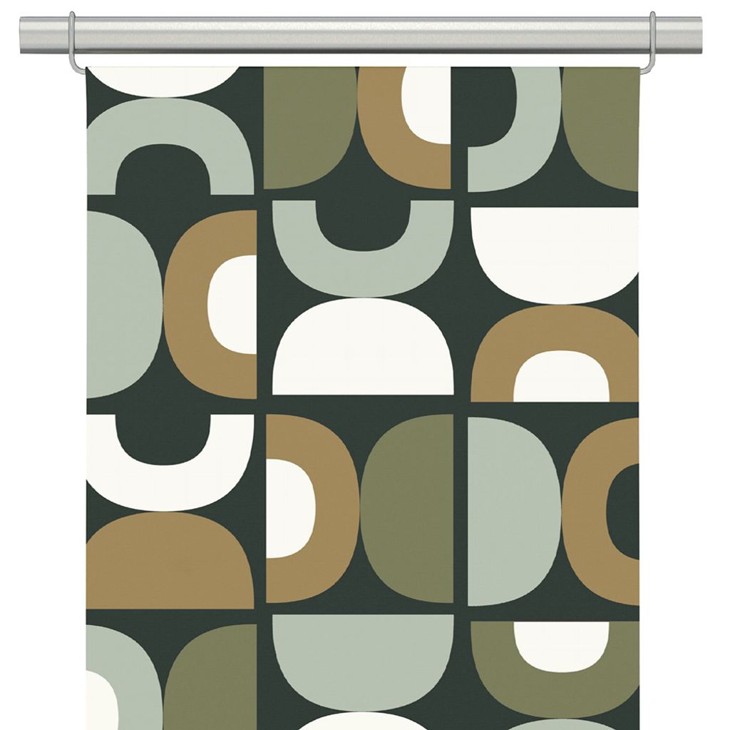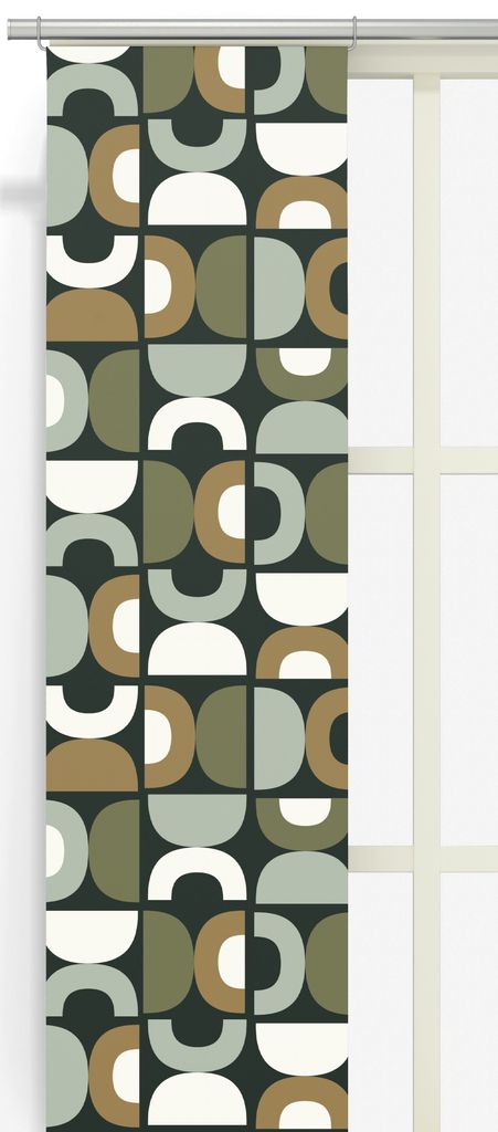 Panelgardin Spiraldans grön med ett mönster av halvcirklar som skapar ett modernt tryck. Den harmoniska färgpaletten i gröna nyanser ger en fin kontrast.