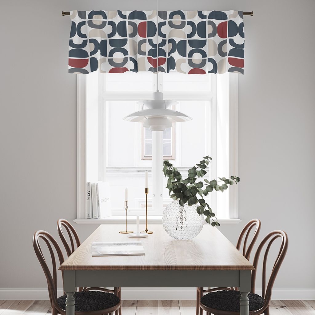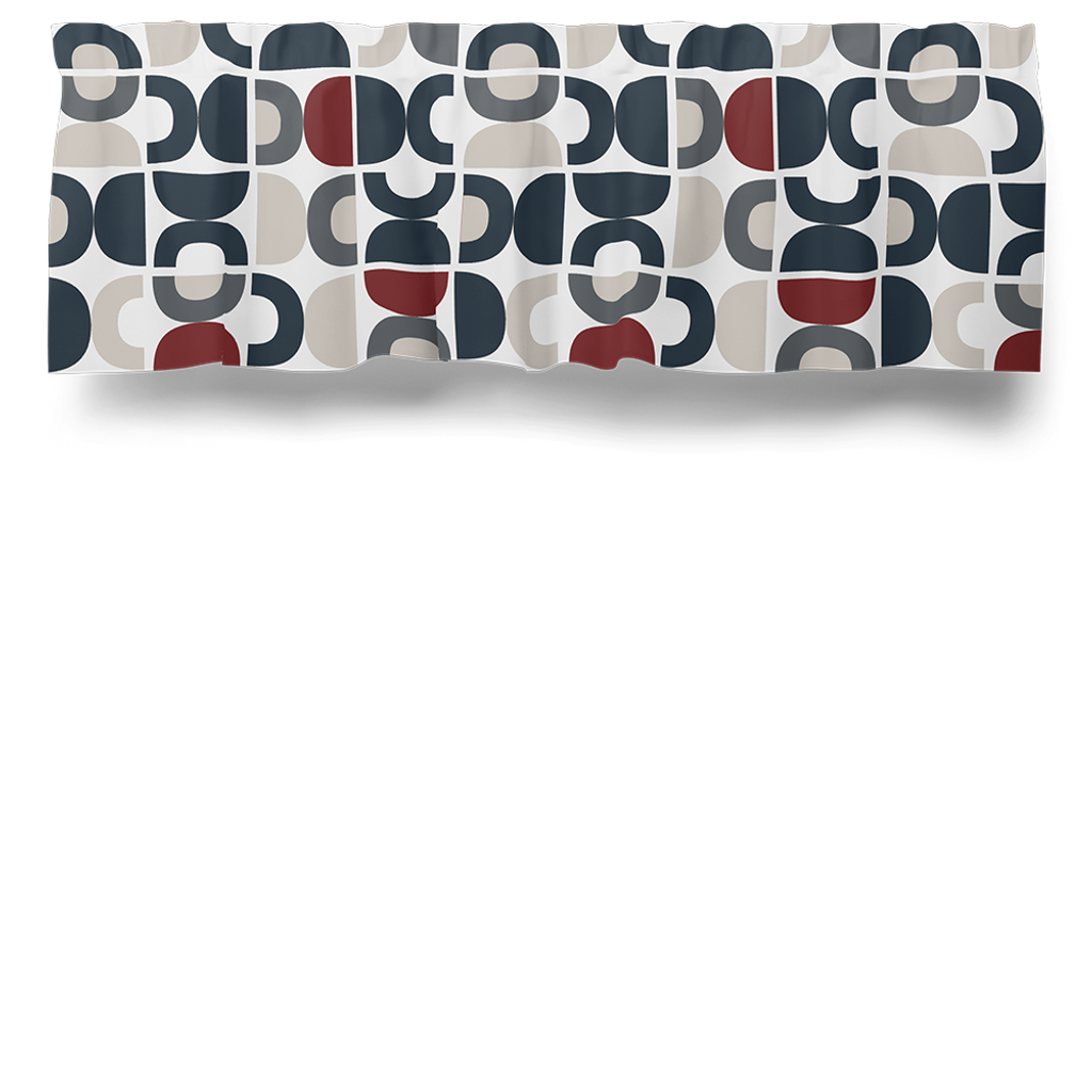 Gardinkappa på metervara med multiband och ofållade sidor. Abstrakt mönster i mörkblå, grå, röd och beige från Björk Forth. Kappan är 55cm hög.
