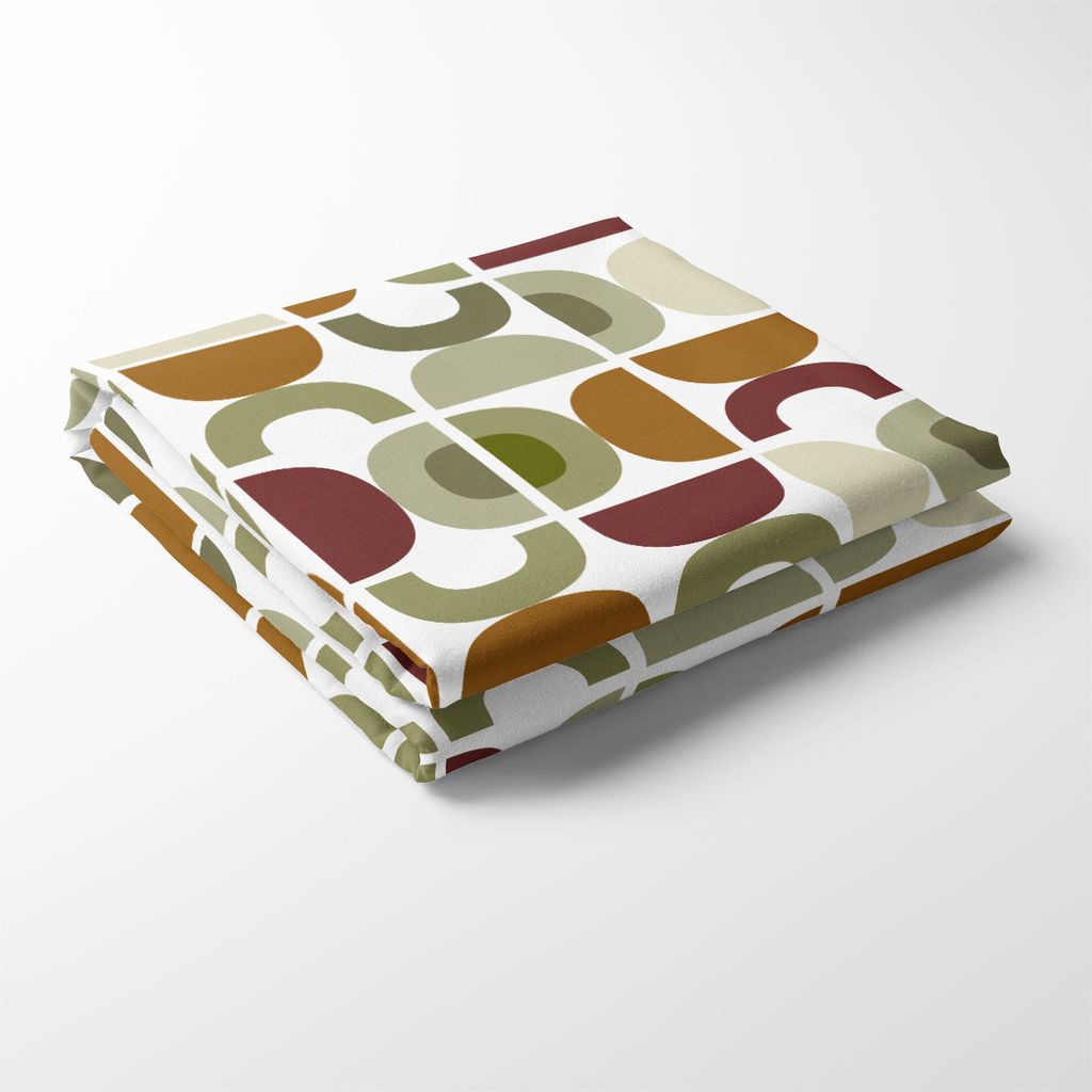 Stor bordsduk i tyget Spiraldans, snyggt abstrakt mönster i rost, grönt och beige.
