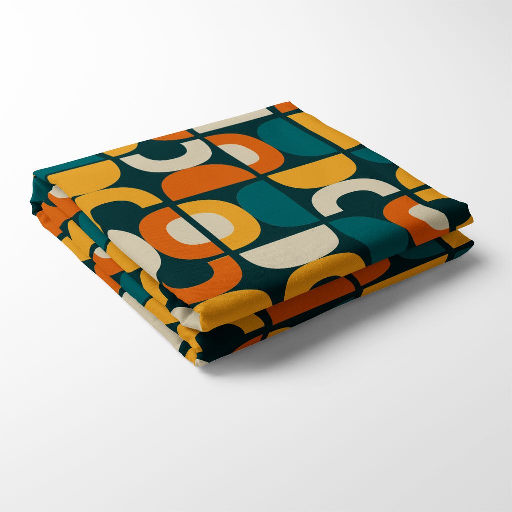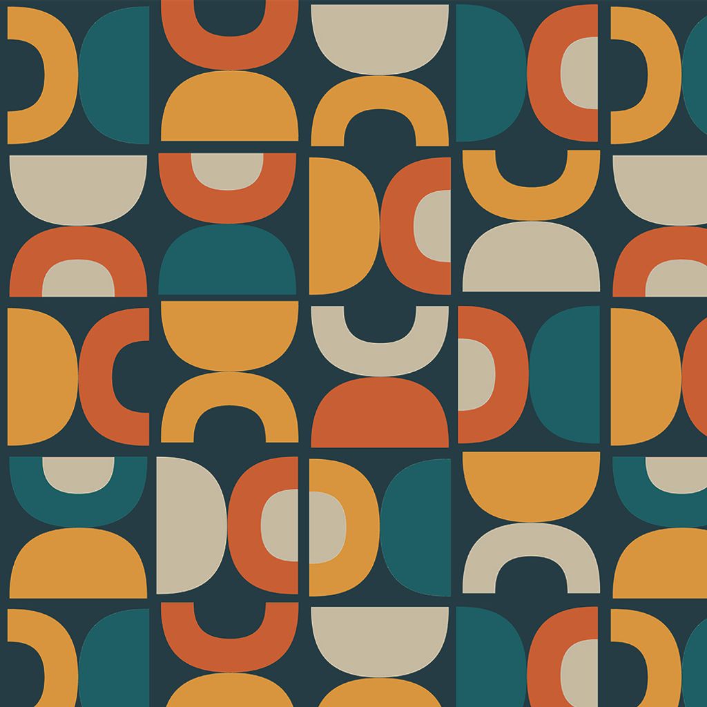 Bordsduk Spiraldans med retroinspirerat mönster i en palett av varma färger djupt orange, senapsgult, grönt och beige på en mörk petrol bakgrund, vilket skapar en härlig kontrast och djup.