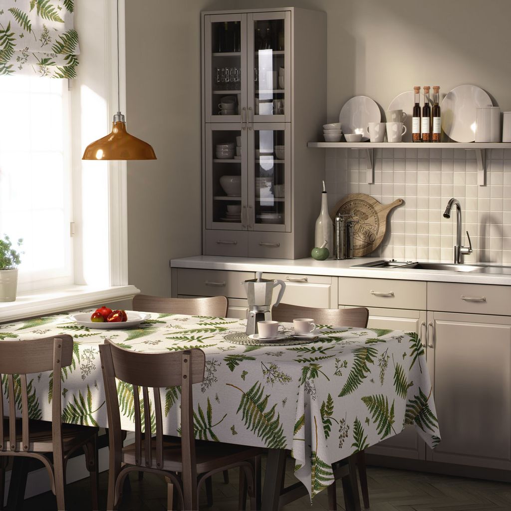 Vacker bordsduk med gröna blad och fjärilar.