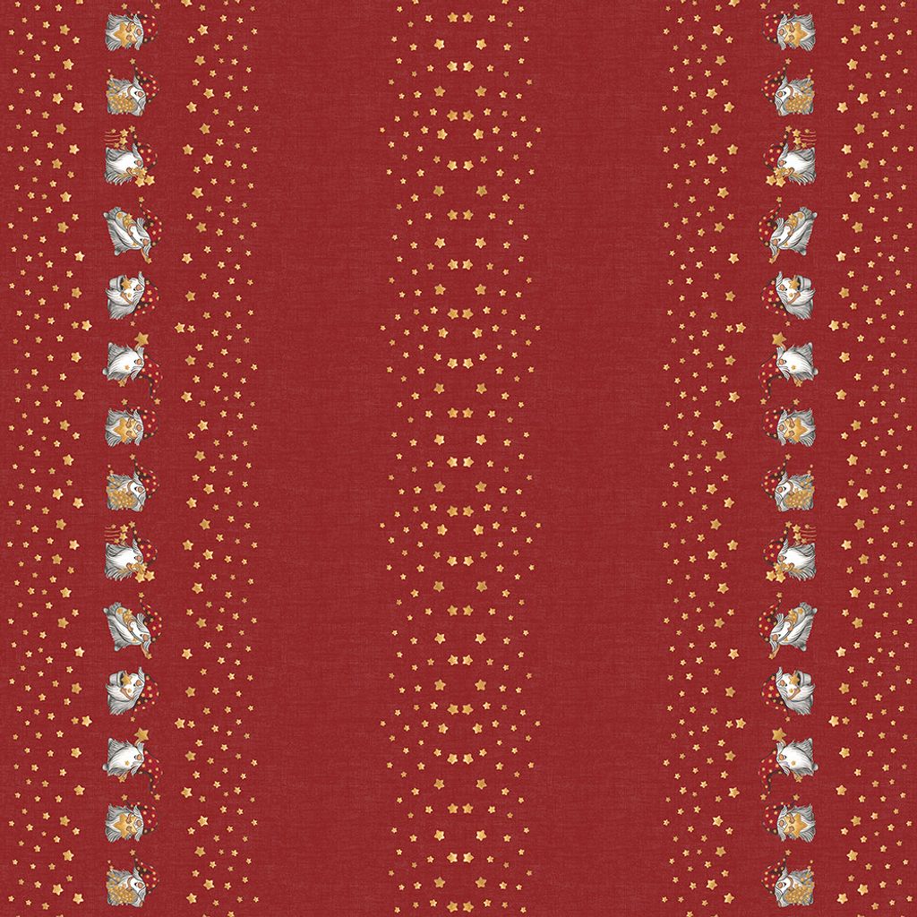 Röd botten med små tomtar och stjärnor längs sidorna av tyget som en bård.