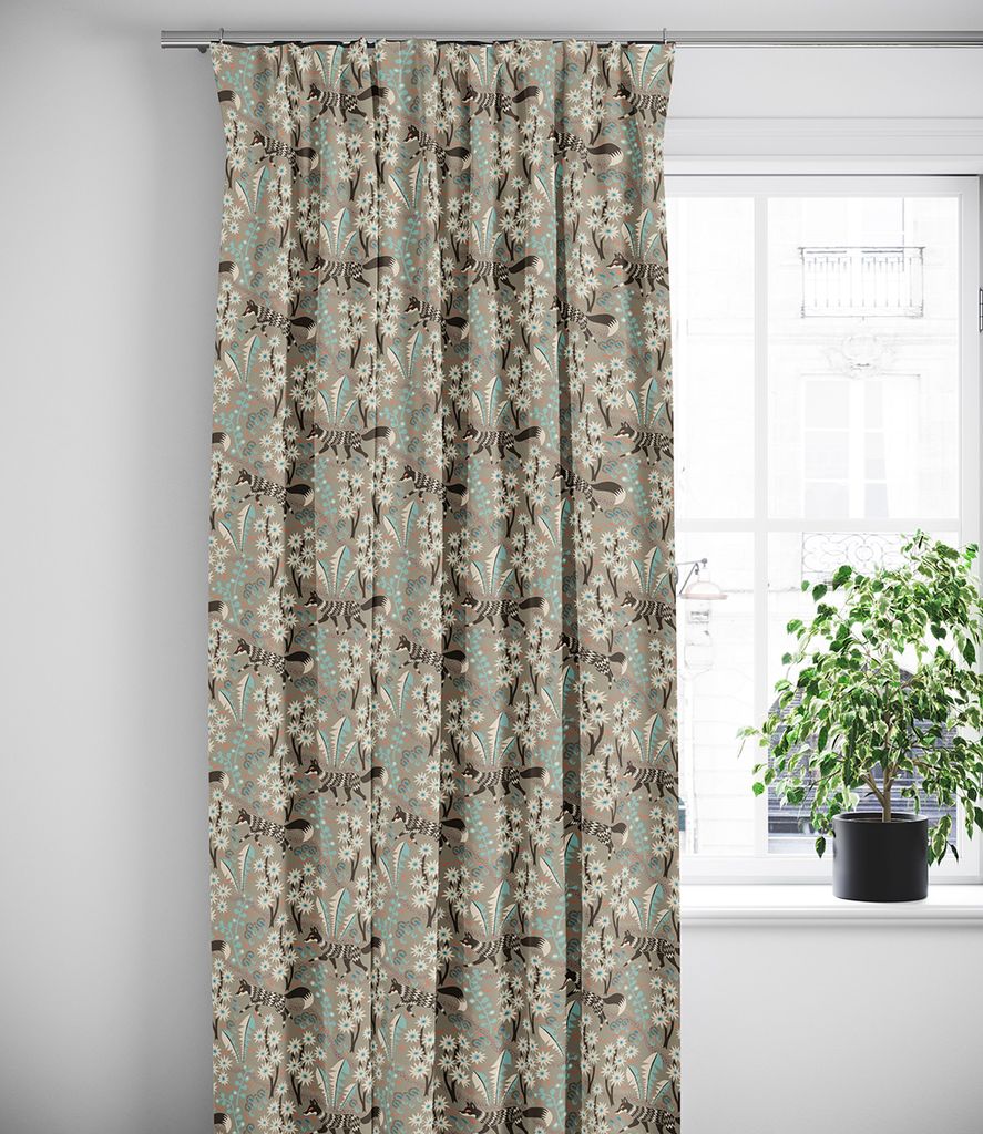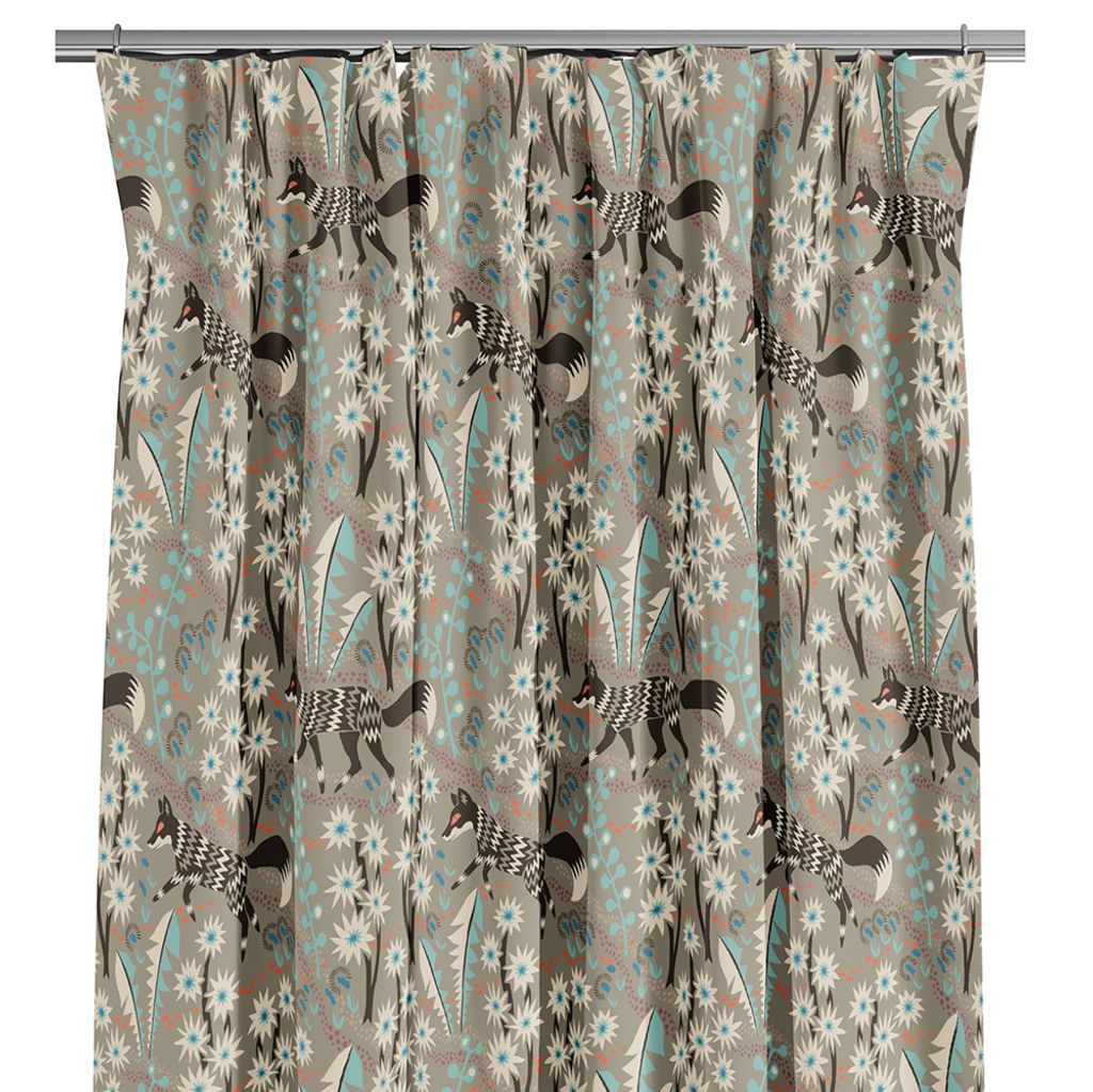 Gardiner med khaki färgad botten, bruna rävar och mönster i mint, orange, blått och rosa.